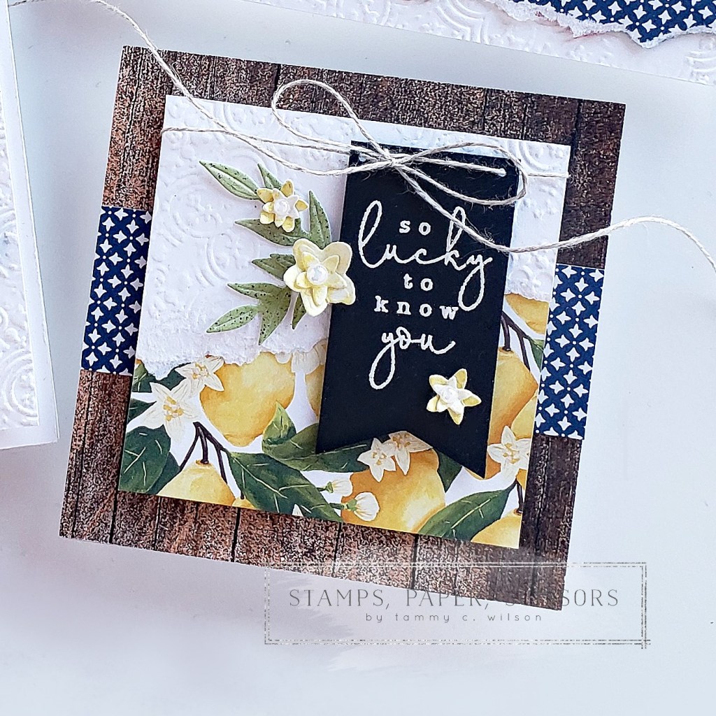 For each of the cards, I used the Distressed Tile 3D Embossing Folder to emboss Basic White Cardstock. I then used a mix of the Mediterraean Blooms Designer Series Paper and the Country Woods Designer Series Paper. For and extra a bit of texture to the cards, I also added Black & Very Vanilla Large Check Ribbon (cut in half lengthwise) and/or Linen Thread.