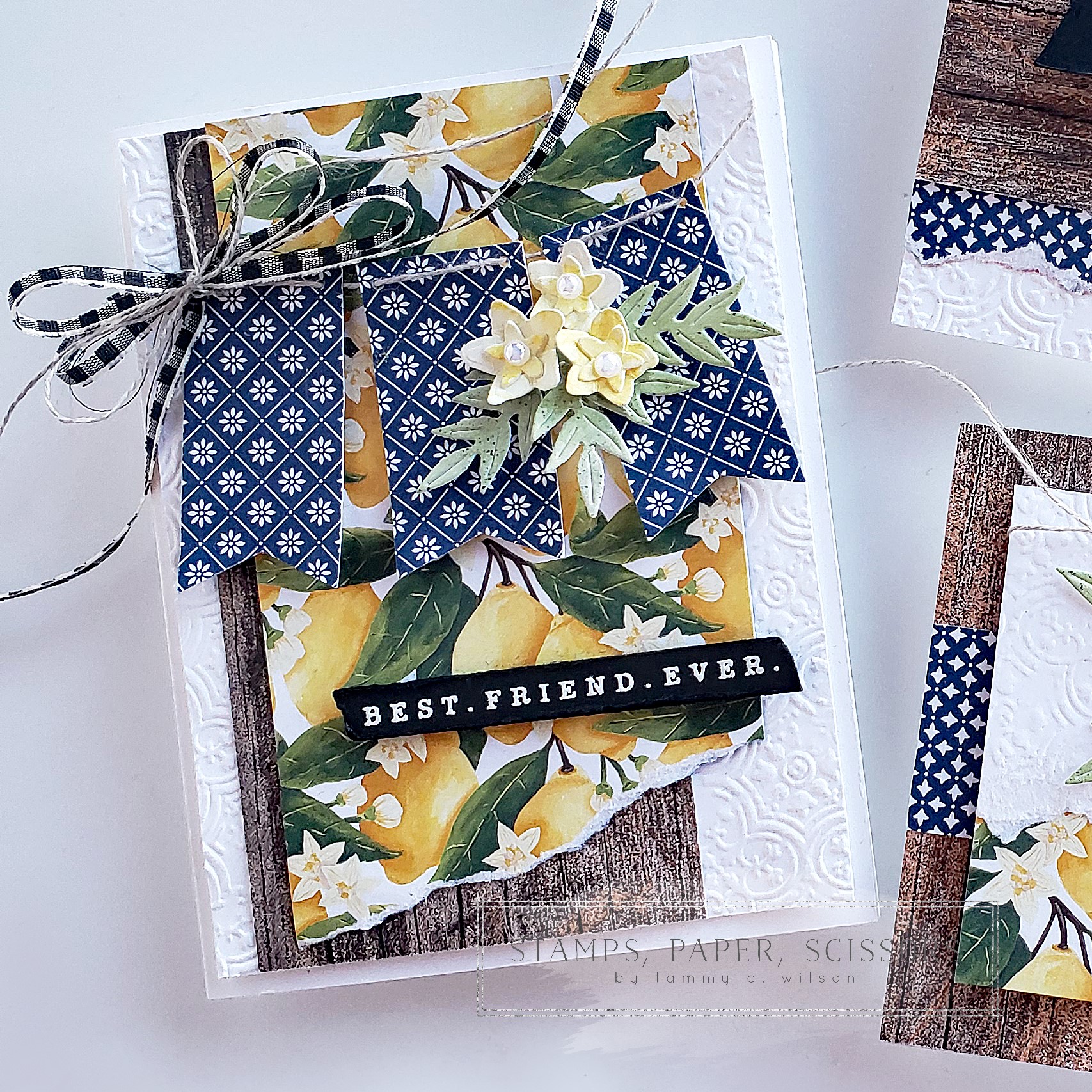 For each of the cards, I used the Distressed Tile 3D Embossing Folder to emboss Basic White Cardstock. I then used a mix of the Mediterraean Blooms Designer Series Paper and the Country Woods Designer Series Paper. For and extra a bit of texture to the cards, I also added Black & Very Vanilla Large Check Ribbon (cut in half lengthwise) and/or Linen Thread.