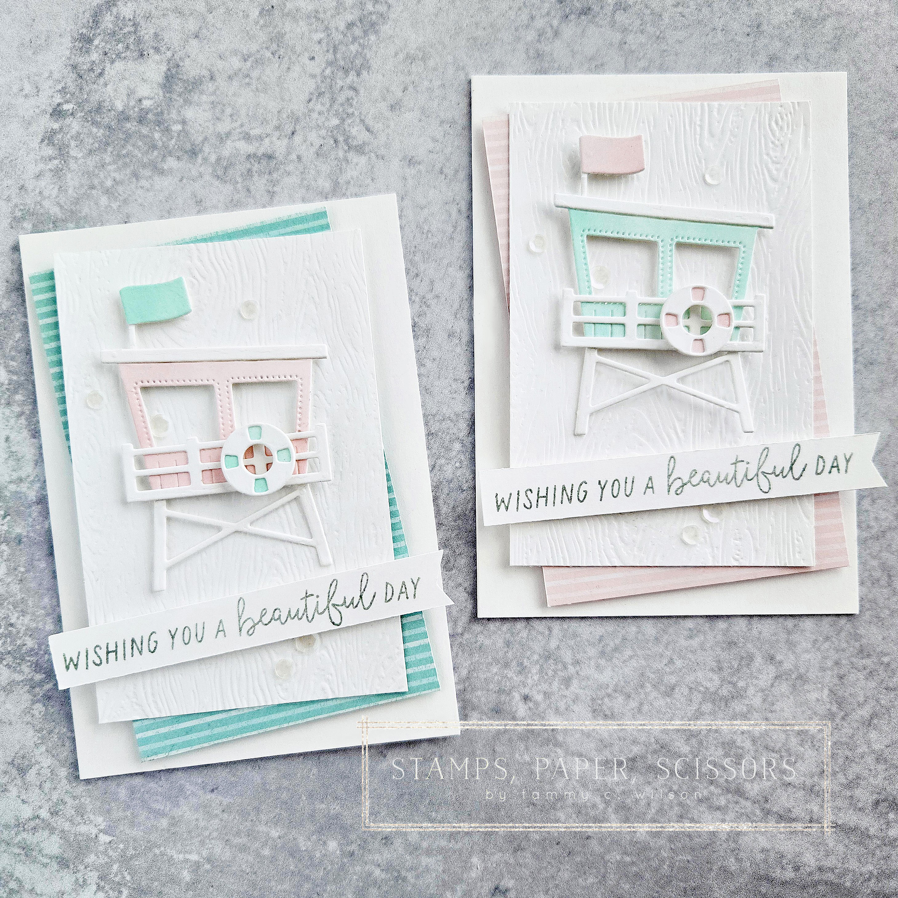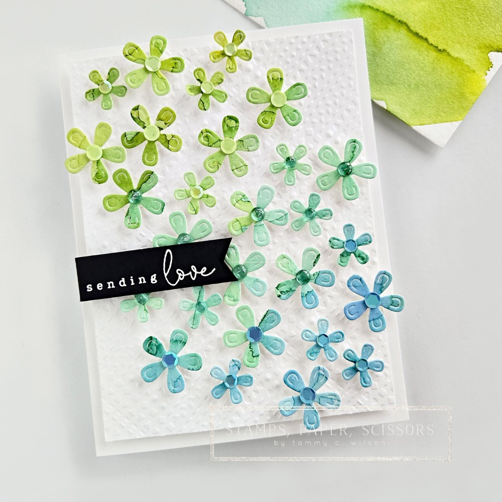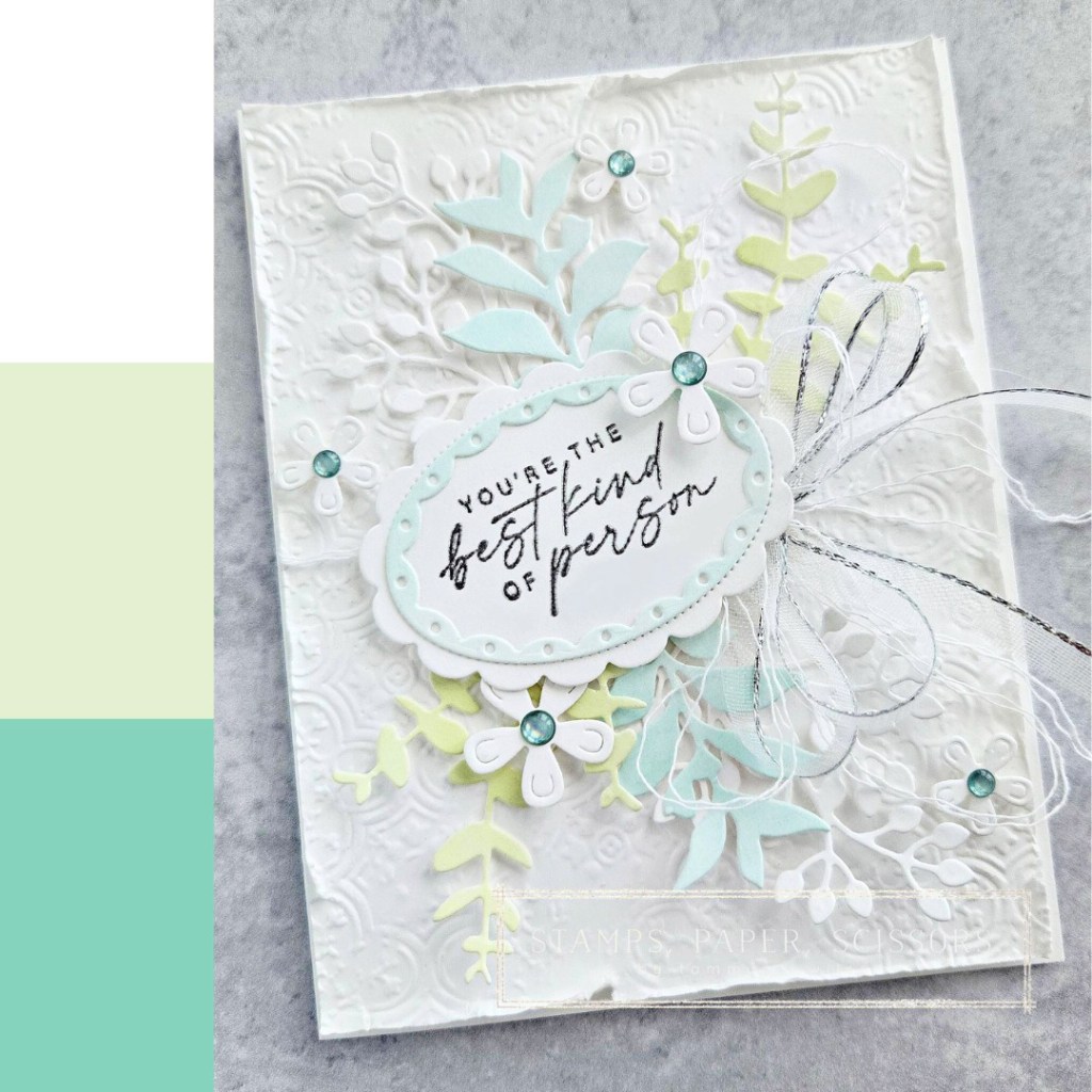 For my card, I chose a color combo with a coastal vibe…..lots of white, along with pale blues and greens. I used Blending Brushes to add Coastal Cabana and Soft Sea Foam to Basic White Thick Cardstock, then cut out the leaves with the Textured Floral Dies. I also used the Unbounded Love Dies, Country Birdhouse Dies, and the Distressed Tile 3D Embossing Folder.