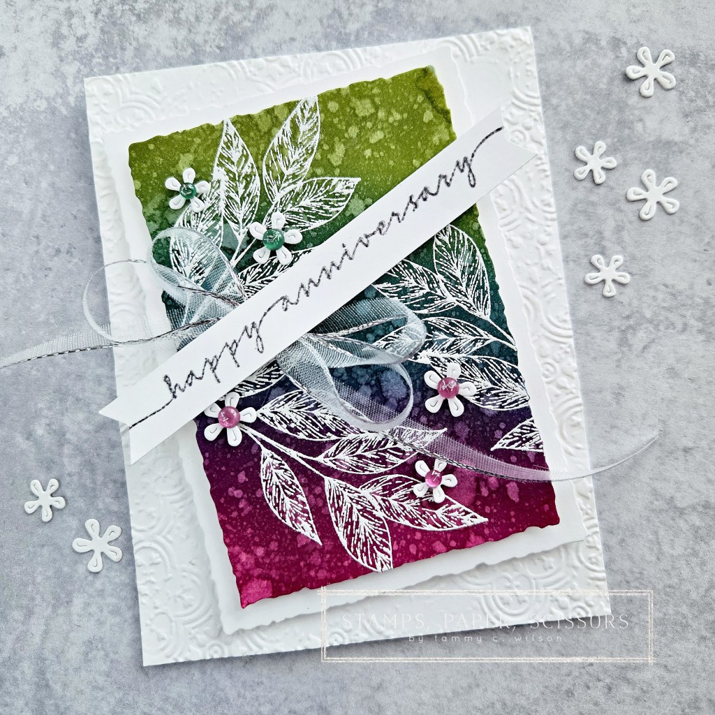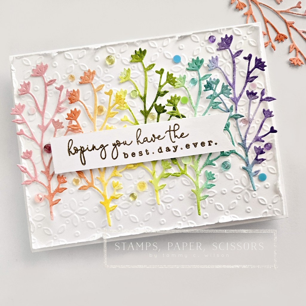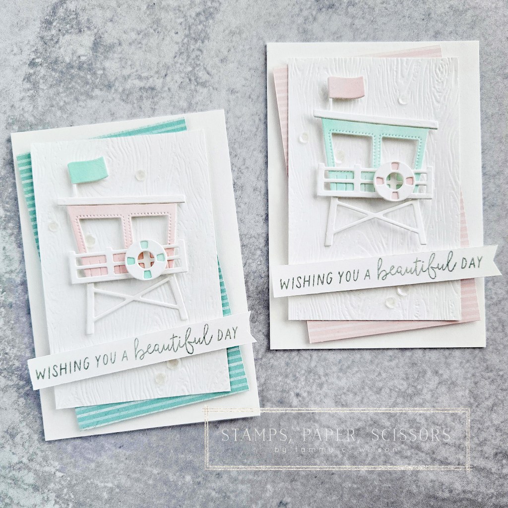For my card, I chose a color combo with a coastal vibe…..lots of white, along with pale blues and greens. I used Blending Brushes to add Coastal Cabana and Soft Sea Foam to Basic White Thick Cardstock, then cut out the leaves with the Textured Floral Dies. I also used the Unbounded Love Dies, Country Birdhouse Dies, and the Distressed Tile 3D Embossing Folder.