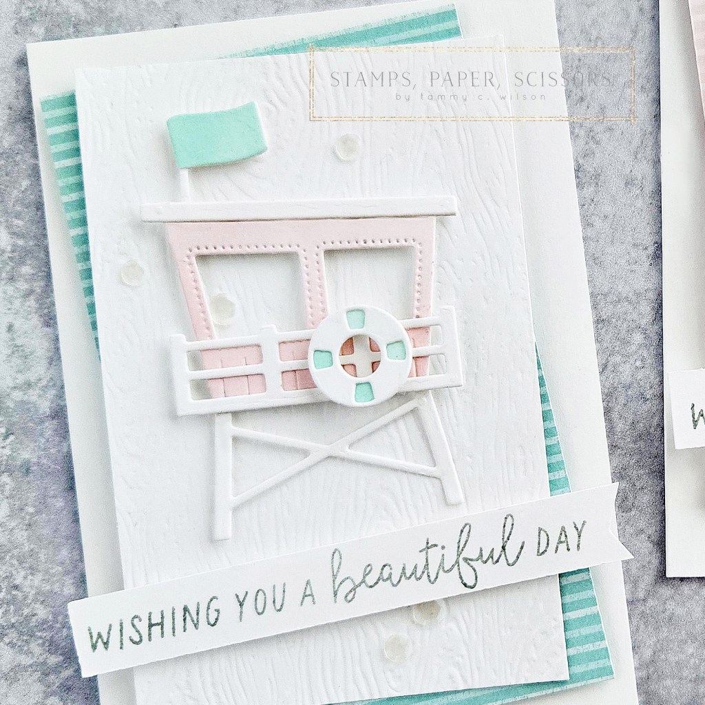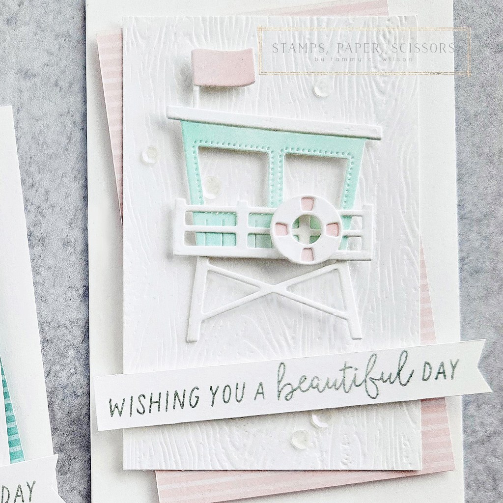 I used the Beach Day Dies to die cut all of the pieces. Before I cut out the lifeguard station itself, I used a Blending Brush to add Pool Party (for the card on the left) and Flirty Flamingo (for the card on the right) to my sone Basic White Thick Cardstock. I also used the same colors (along with a Blending Brush) for the life preserver and the little flag.