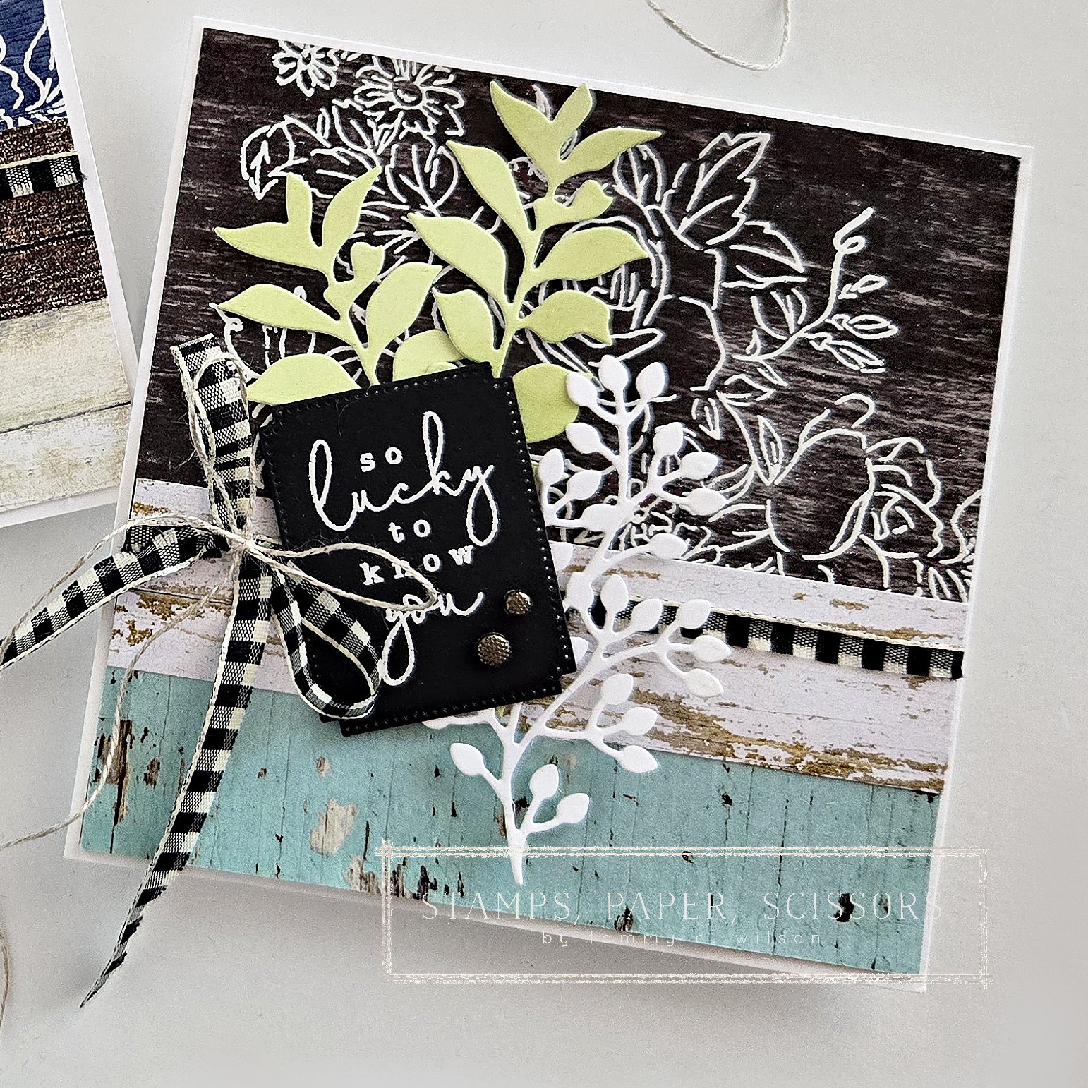 08.01.2024…..Happy Thursday, my stampin’ friends! One of my favorite things to do is to create cards with bits and pieces that are left over from other projects. So……today, I created these 4-3/4″ square cards, using leftover pieces of Country Woods Designer Series Paper. (FYI…this is also my one of my fave DSP collections of all time, so of course I ordered more than one package.) Hope this card inspires you to create a card or projects using some of your extra DSP bits and pieces, too!