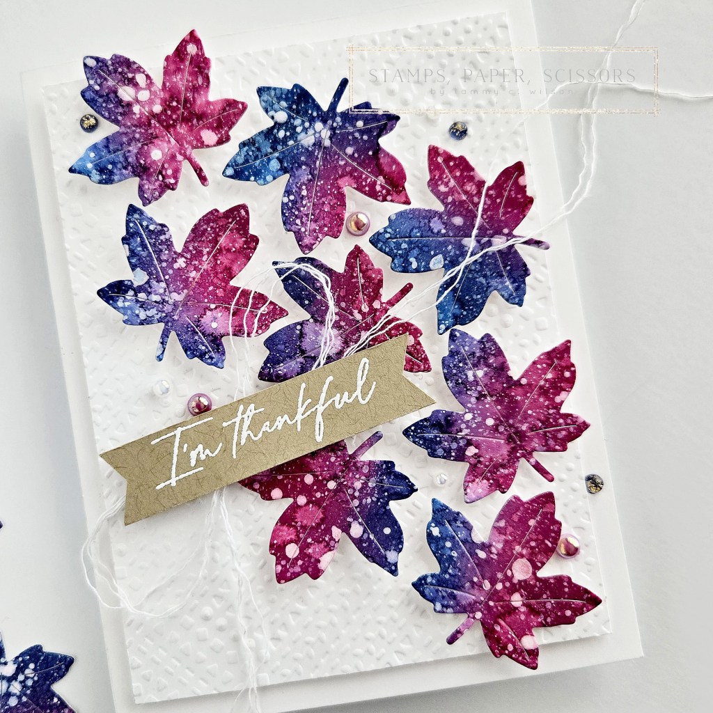 To create the leaves, I used Blending Brushes to add Berry Burst and Night of Navy to Basic White Thick Cardstock. Next I used a Water Painter to splatter water droplets on the cardstock, and dried it with a Heat Tool. Next, I used a Water Painter, along with White Craft Ink, to add more splattering. After I dried the paper again with a Heat Tool, I cut out all of the leaves with one of the Autumn Leaves Dies, and popped them up with Stampin’ Dimensionals.