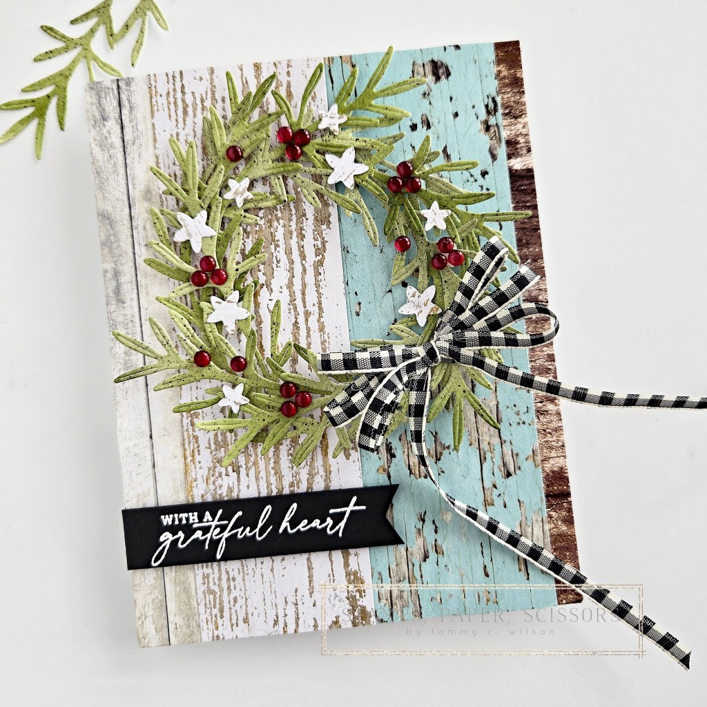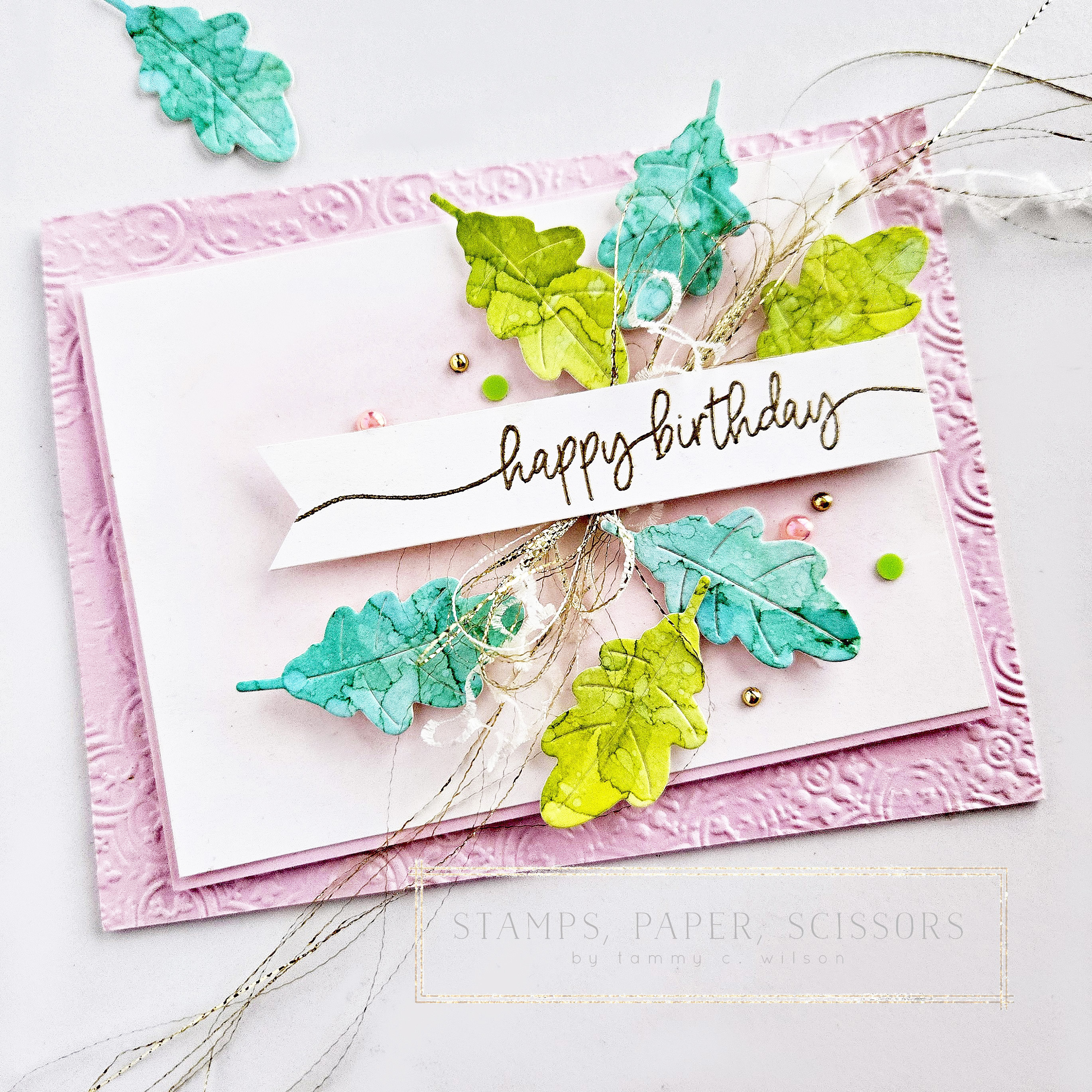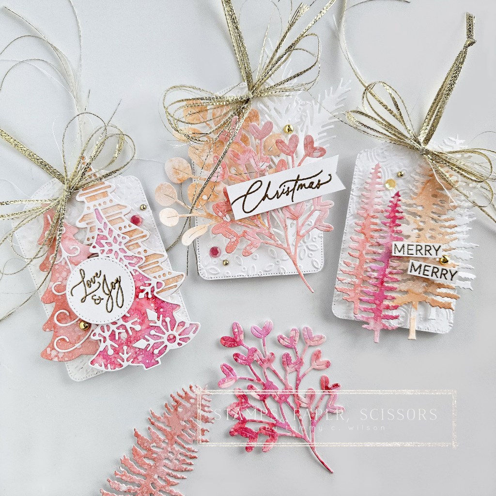 I love to make gift tags for any occasion, but I think holiday tags are my favorite. To create the paper for diecutting, I used Blending Brushes to add Petal Pink, Flirty Flamingo, and Melon Mambo to Basic White Thick Cardstock. I used a Water Painter to splatter water droplets, and then used the Water Painter with White Craft Ink to add more splattering. I also used the Decorative Trees Dies, Forever Forest Dies, Golden Greenery Dies, and the Greetings of the Season Bundle.