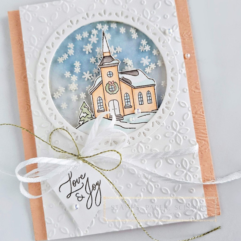 I stamped the church (from the Yuletide Village Stamp Set) on Basic White Thick Cardstock, using a Gray Granite Classic Stampin’ Pad. To color the church, I used the following Stampin’ Blends Marker Combo Packs…..Petal Pink, Soft Sea Foam, Balmy Blue, and Gray Granite. I “fussy cut” the church, and adhered it underneath window, and then adhered a Window Sheet behind it. Next, I used Foam Adhesive Strips on the back side of the window (to create a “pond”) and added the White Loose Snowflakes. To create the background for the window, I used a Blending Brush to add Balmy Blue to Basic White Thick Cardstock.
