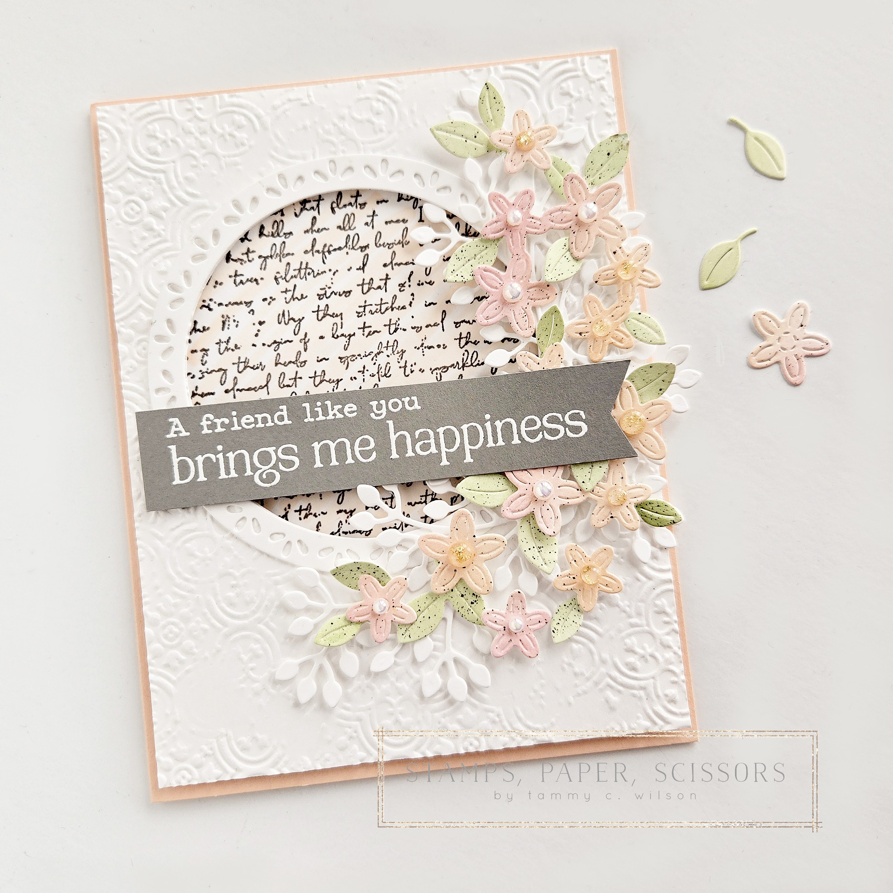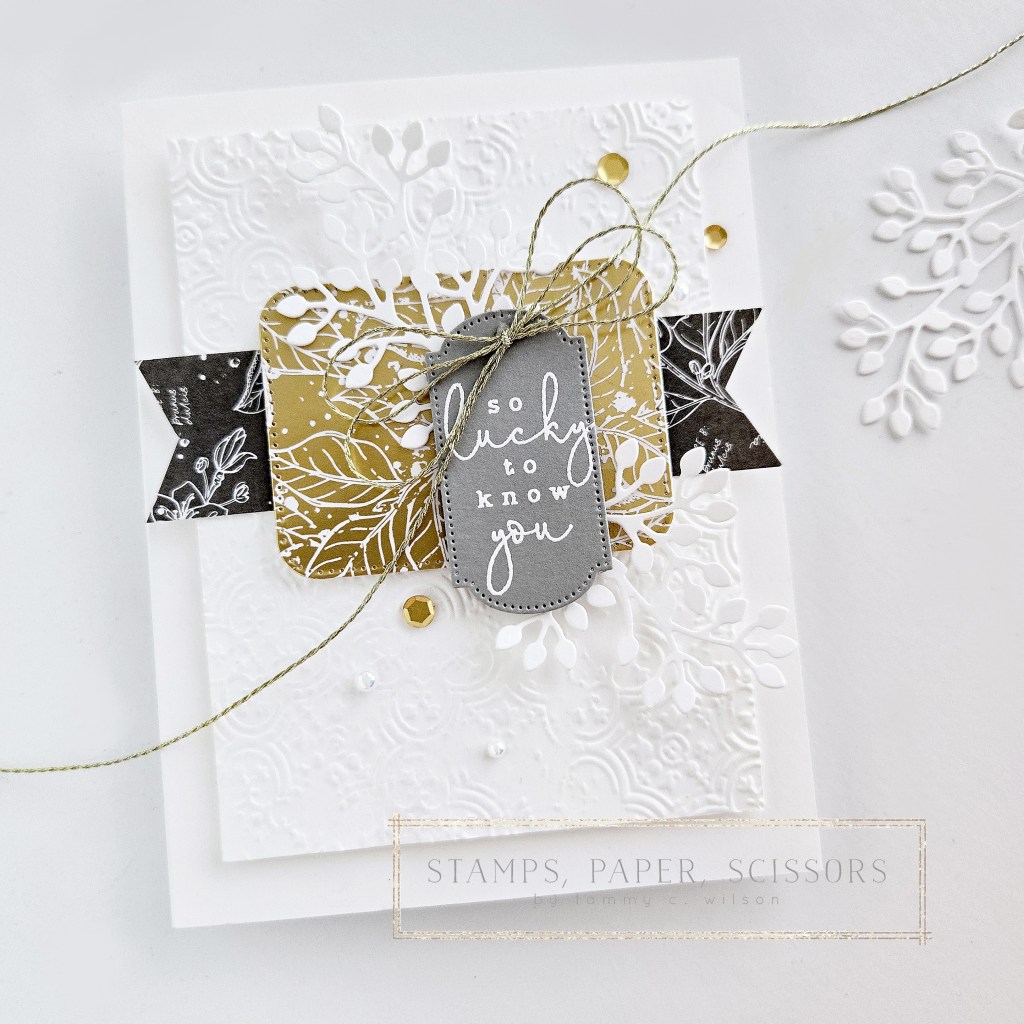 For my card, I wanted to create something neutral, but with a bit of a shimmer, and the Nature’s Sweetness Specialty Designer Series Paper was just perfect for that. I also used the Nested Essential Dies, Greetings of the Season Dies, and Textured Florals Dies. Hope this card inspires you to create a card or project, using this week’s challenge!