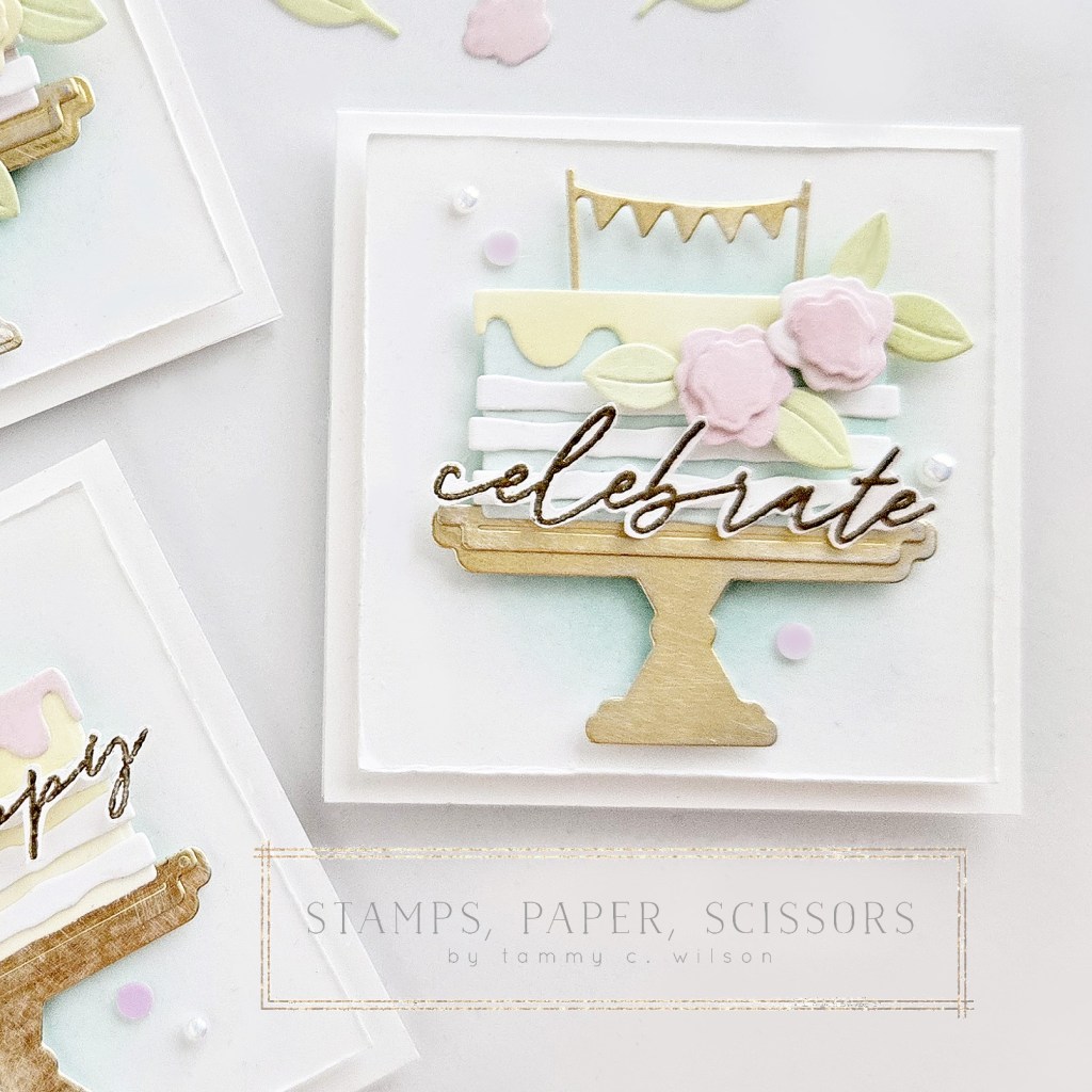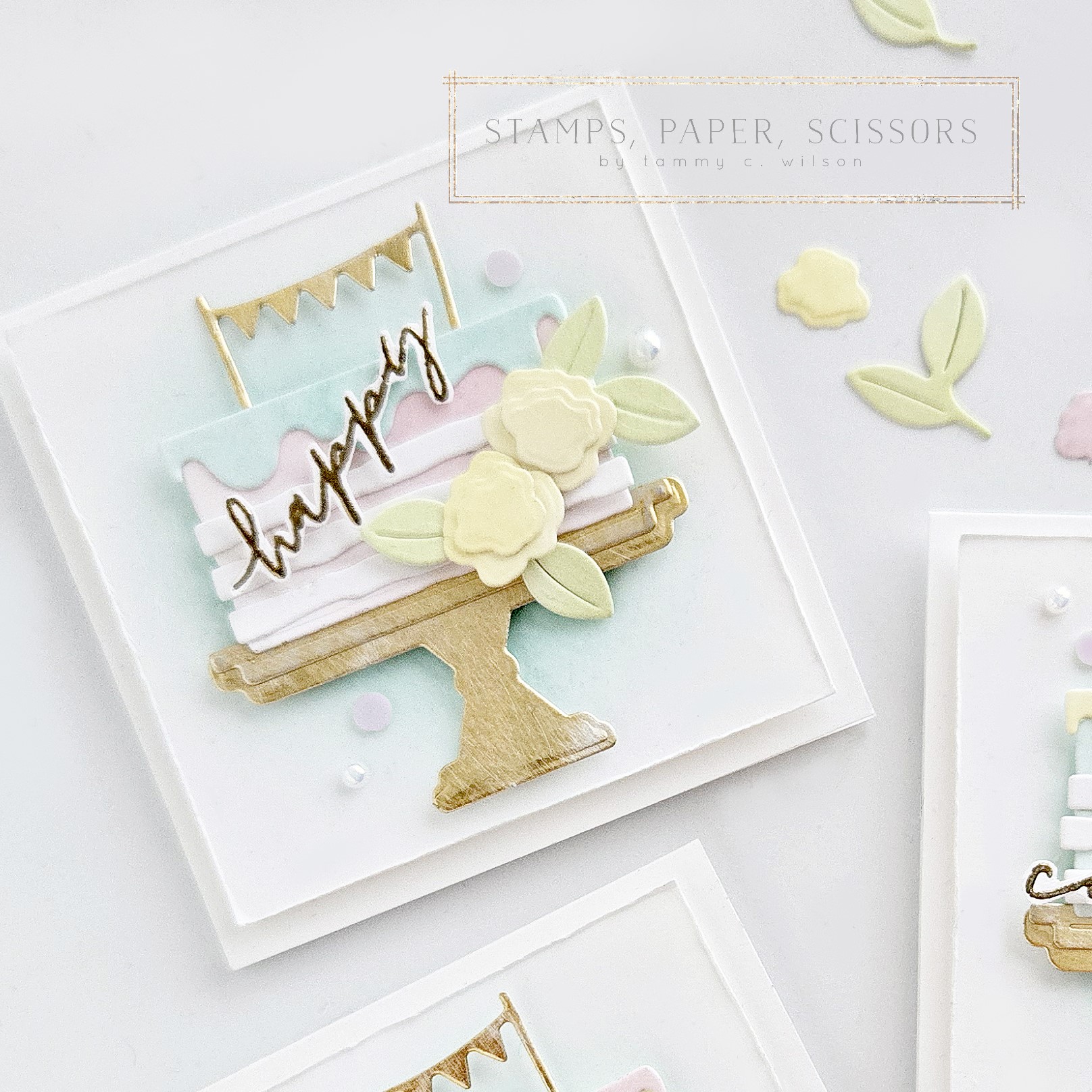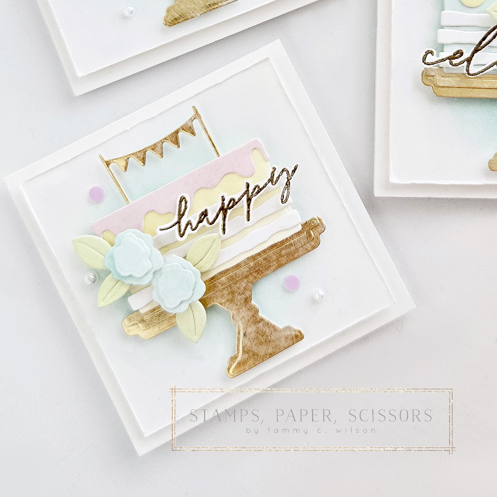 For each of these cards, I used a Blending Brush, along with a Pool Party Classic Stampin’ Pad, to add color to the background. To create cake stand and the little banner on each of the cakes, I used a nail buffer to sand a Gold Foil Sheet. I then cut out all of the pieces with the Cake Celebrations Dies.