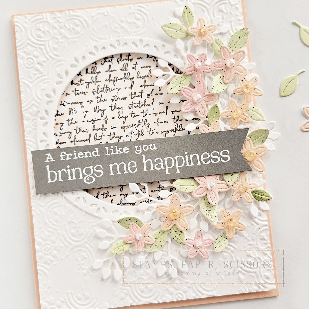 For this card, I used on of the Spotlight on Nature Dies to cut out a circle from Basic White Thick Cardstock. I then used another one of the Spotlight on Nature Dies to cut out the frame. To create the background behind the frame, I used my Gray Granite Classic Stampin’ Pad to stamp the image (from the Elements of Text Stamp Set) on Basic White Thick Cardstock. I also added some quick strokes of color, using a Light Petal Pink Stampin’ Blends Marker. Next, I used Stampin’ Dimensionals to adhere the entire panel to a Petal Pink Cardstock base.
