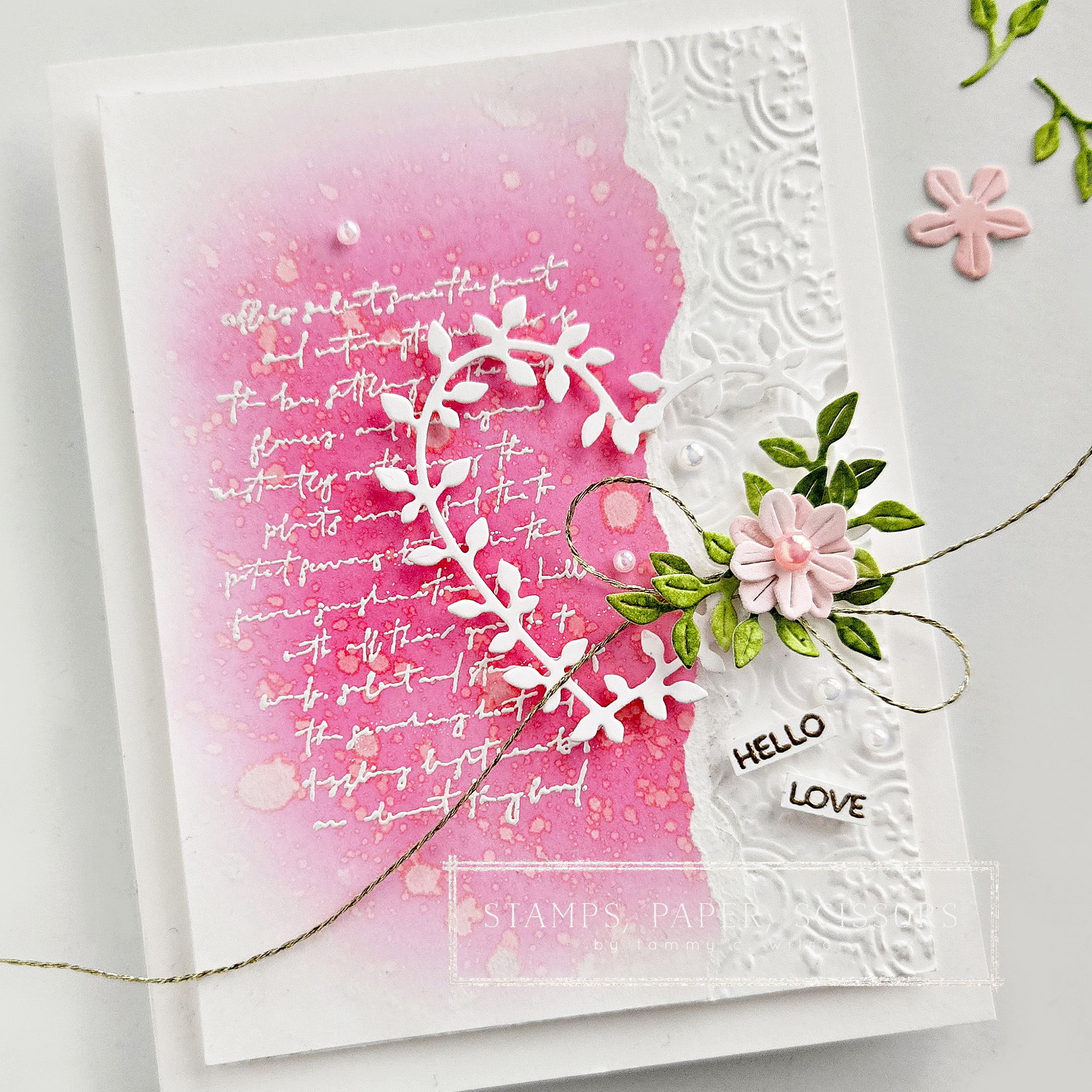 To create the heart, I used one of the dies from the Heart Shaped Bundle, along with Basic White Thick Cardstock. To create the flowers and leaves, I used Blending Brushes to add Pretty in Pink and Granny Apple Green to Basic White Thick Cardstock. I also used a Water Painter to splatter water droplets. After I dried the paper with a Heat Tool, I cut out the flowers and leaves with dies from the Heart Shaped Bundle.