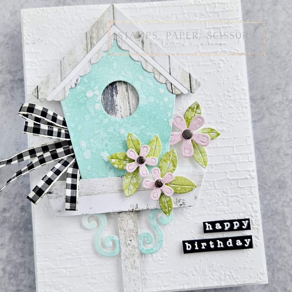 03.09.2025…..Happy Sunday, my stampin’ friends! I created this card with another die set that I had not used in awhile…..the Country Birdhouse Dies. It is so much fun, and gives you lots of options for creating the birdhouse. For this card, I used the Country Woods Designer Series Paper, along with adding ink and splatters to Basic White Thick Cardstock. Hope this card inspires you to grab a few nore dies that you haven’t used recently, and create a card or project, as well.