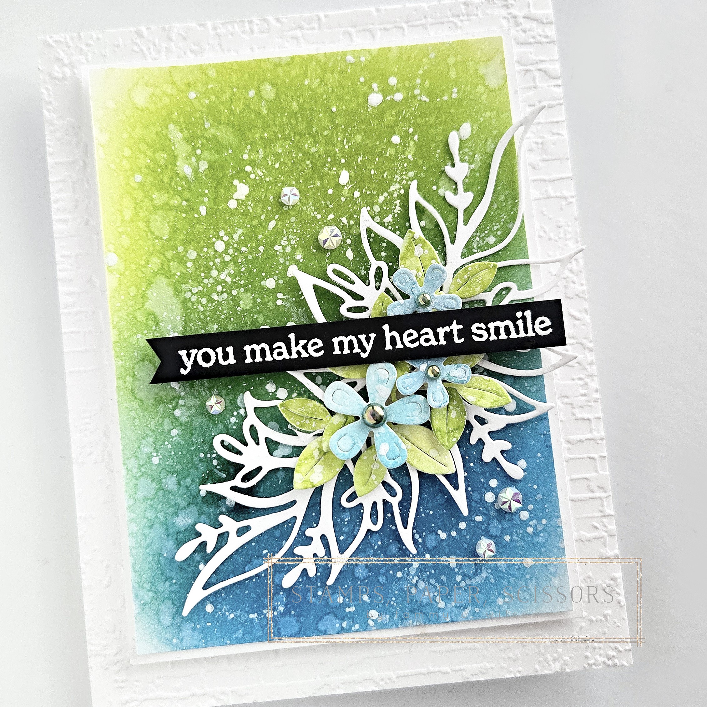 To create the leaves and flowers, I used Blending Brushes, along with Lemon Lime Twist, Granny Apple Green, and Coastal Cabana. Before I die cut these pieces, I used a Water Painter to splatter water droplets, and dried the cardstock with a Heat Tool. I then used a Water Painter, along with White Craft Ink to add some splatters. Layered underneath the flowers and leaves, is a die cut created with Basic White Cardstock, using one of the Thoughtful Wishes Dies.