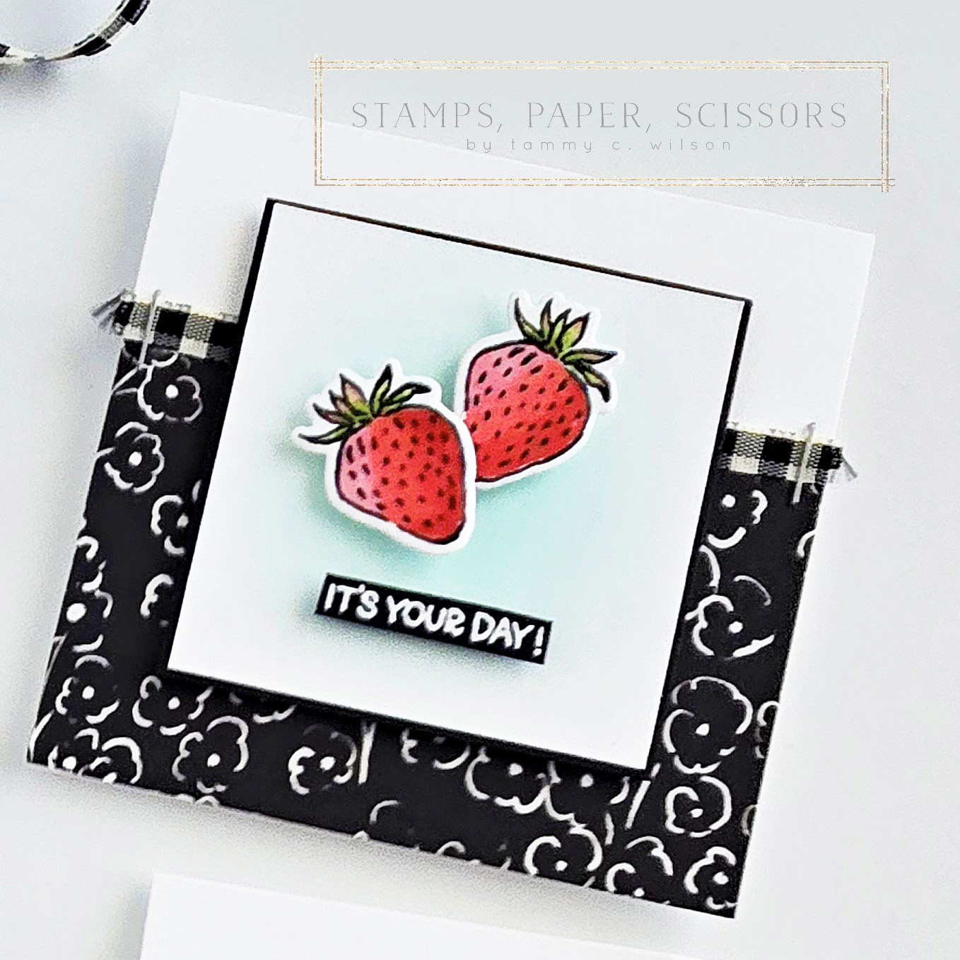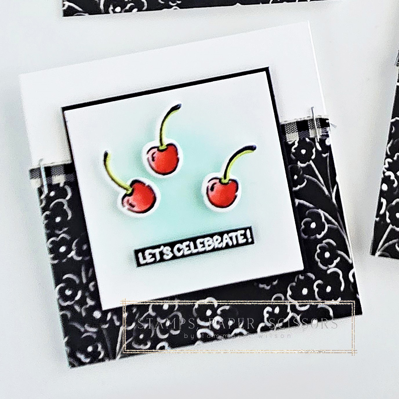 For each of these 3″ x 3″ card, I started with a Basic White Thick Cardstock base, then added a small strip of Mixed Media Florals Designer Series Paper. For an extra bit of texture, I added Black & Very Vanilla Large Check Ribbon (cut in half lengthwise) at the top of the DSP strip, then added a mini staple at each end of the ribbon.