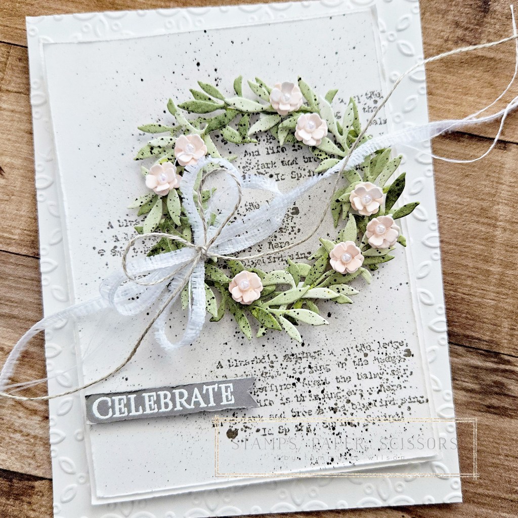 To create the wreath, I used a Blending Brush to add Mossy Meadow ink to Basic White Thick Cardstock, and added speckling with an Early Espresso Stampin’ Write Marker. I then used one of the Gallery Blooms to cut out several little branches, and layered them together in a “wreath” shape. To create the layered flowers, I used a Blending Brush to add Petal Pink to Basic White Thick Cardstock, then used one of the Perfectly Pears Dies (an upcoming Online Exclusive) to cut out lots of tiny flowers. After I distressed the all of then flowers, I layered three of them together to create each of the completed flowers.