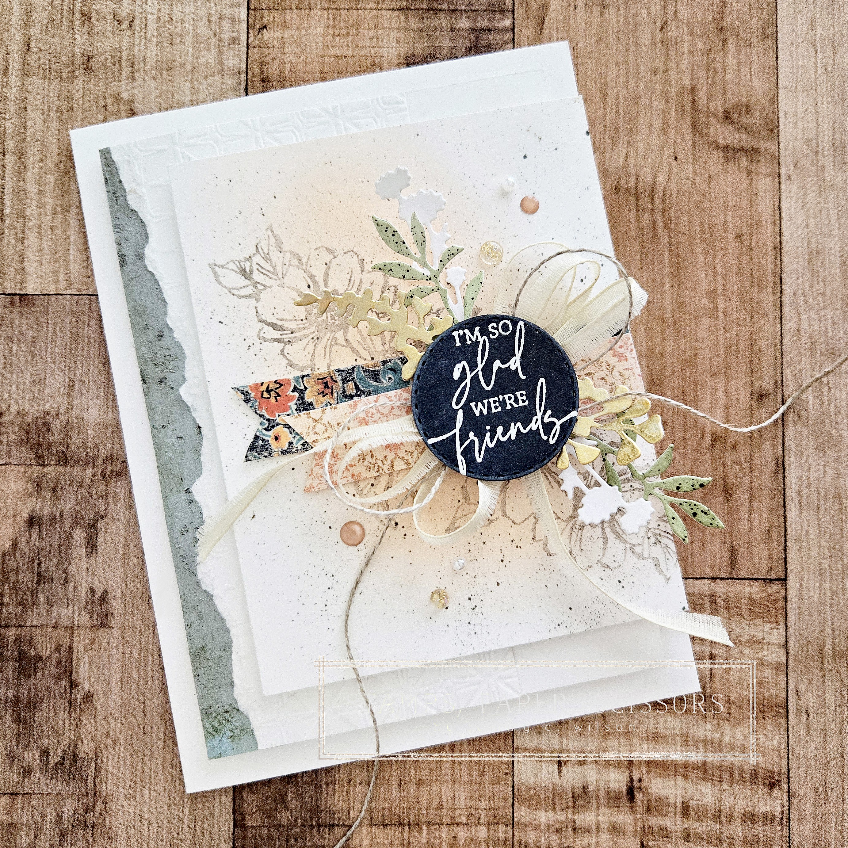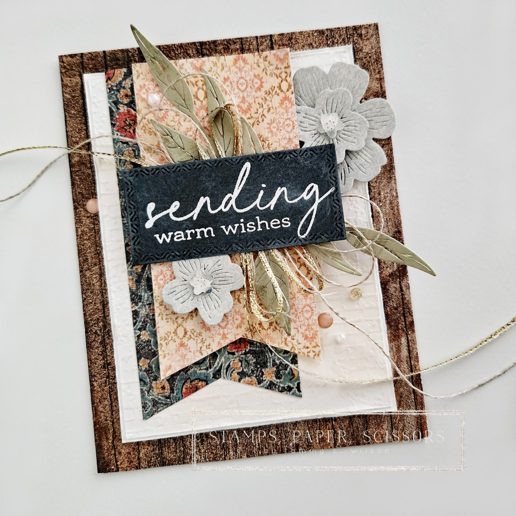 For my card, I chose to use the Impressions Abloom Dies (for all the for the flowers branches)…..along with the Beautiful Gallery Designer Series Paper and the Country Woods Designer Series Paper. For the heat-embossed sentiment, I used the Notes & Totes Stamp Set.