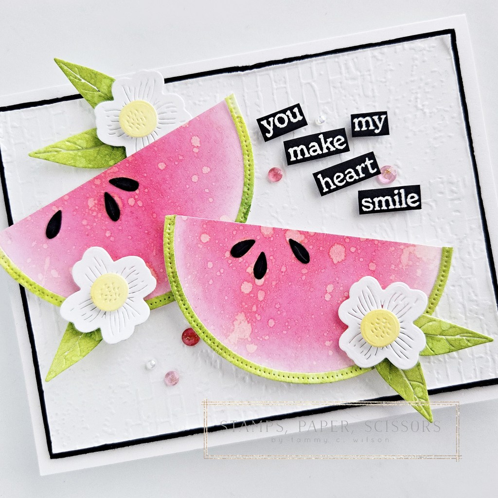 07.28.2025…..Happy Sunday, my stampin’ friends! Today, I’m sharing a card that I created with Impressions Abloom Dies. Not only did I use the dies to create the flowers and leaves, but I also used them to create the watermelon slices. I used the large label die for the watermelon, and the large label border die for the watermelon rind….then cut them in half to create the two slices. Hope this card inspires to use your some of your favorite dies in a fun, unique way!