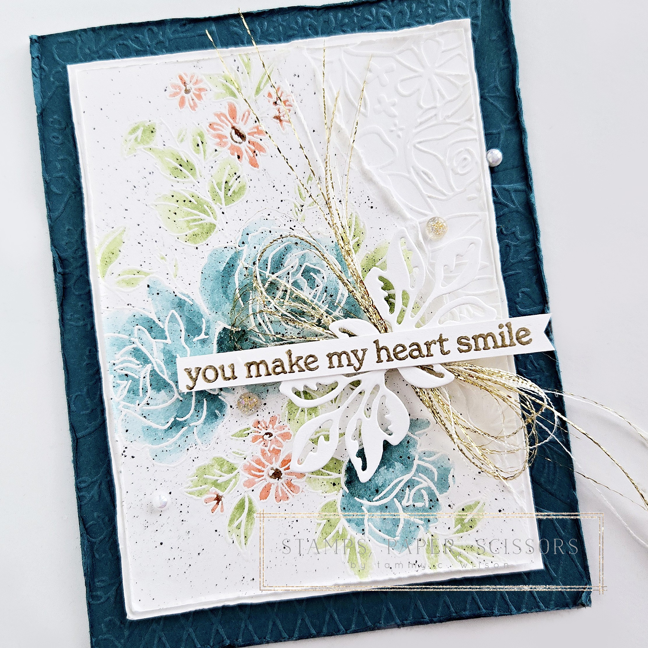 For this card, I started with some Pretty Peacock Cardstock, and embossed it with the Joined Together 3D Embossing Folder, and adhered it to a Pretty Peacock Cardstock base. Next, I heat-embossed the large floral bouquet (from the Layers of Beauty Bundle) on Basic White Thick Cardstock, using my Versamark Pad and White Embossing Powder. I then used a Water Painter to color the image with Calypso Coral, Soft Sea Foam, Pretty Peacock, and Pecan Pie. I also added some speckling with an Early Espresso Stampin’ Write Marker, and tore off the right side of the cardstock. Underneath the right edge, I layered some Basic White Thick Cardstock that I embossed with one of the Glass & Gardens Embossing Folders. I then layered another piece of Basic White Cardstock underneath, and used Stampin’ Dimensionals to adhere the entire panel to the card base.