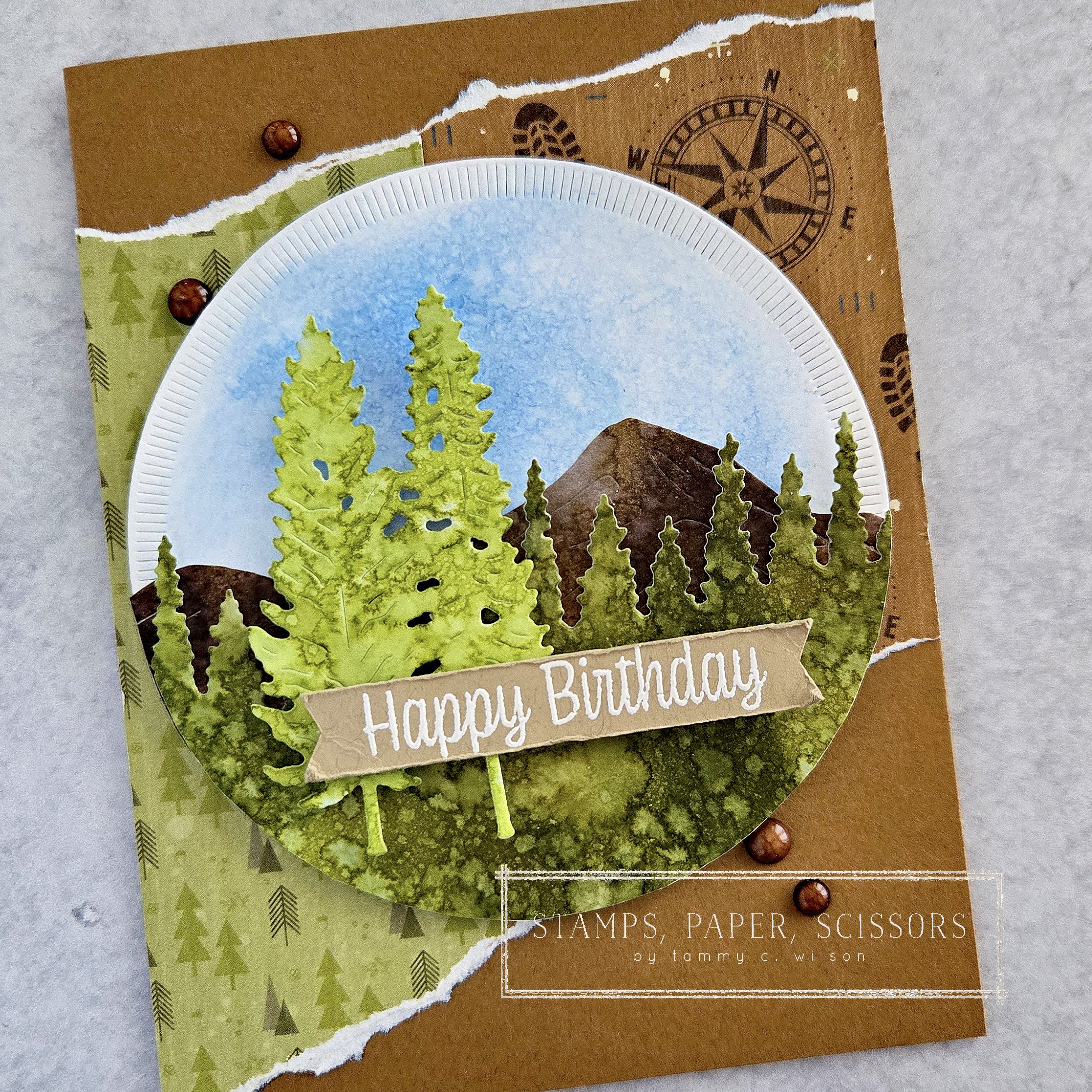 09.25.2025…..Happy Thursday, my stampin’ friends! Today, I’m sharing a “guy” card that I created with the Scenic Adventures Dies. Before I die cut the pieces, I used Blending Brushes to add ink to Basic White Cardstock, then splattered water droplets with a Water Painter. Hope this card inspires to create a card or project, using the Scenic Adventures Dies as well!