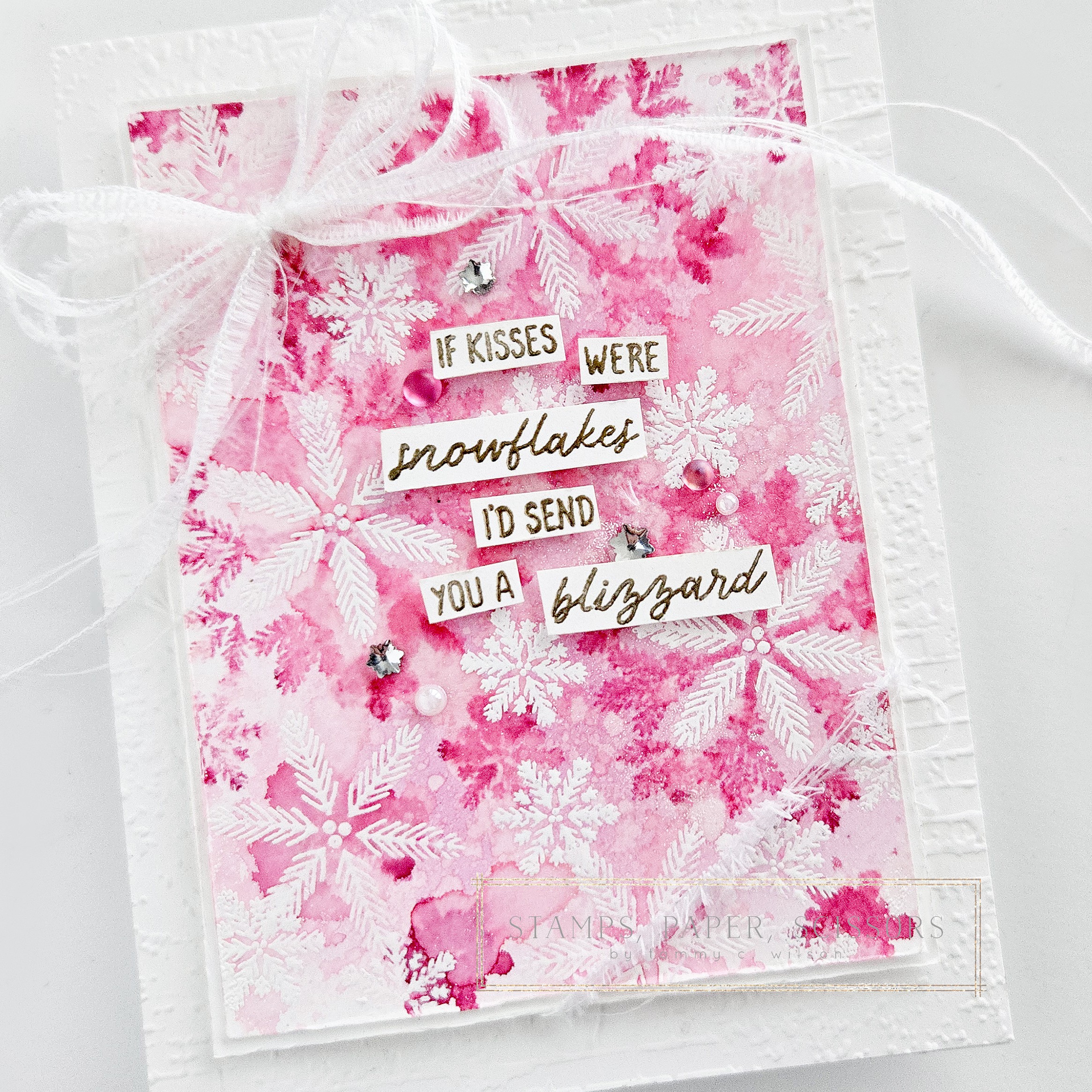 The sentiment (from the Snowflake Kisses Bundle) was heat-embossed on Basic White Thick Cardstock, using my Versamark Pad and Gold Embossing Powder. To create the bow, I used White 1/4″ Ribbon, cut in half lengthwise. For a bit of bling, I sprinkled on Faceted Snowflakes, Frosted Iridescent Dots, and Iridescent Pearl Basic Jewels.