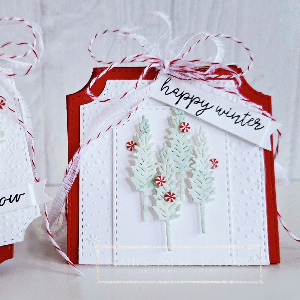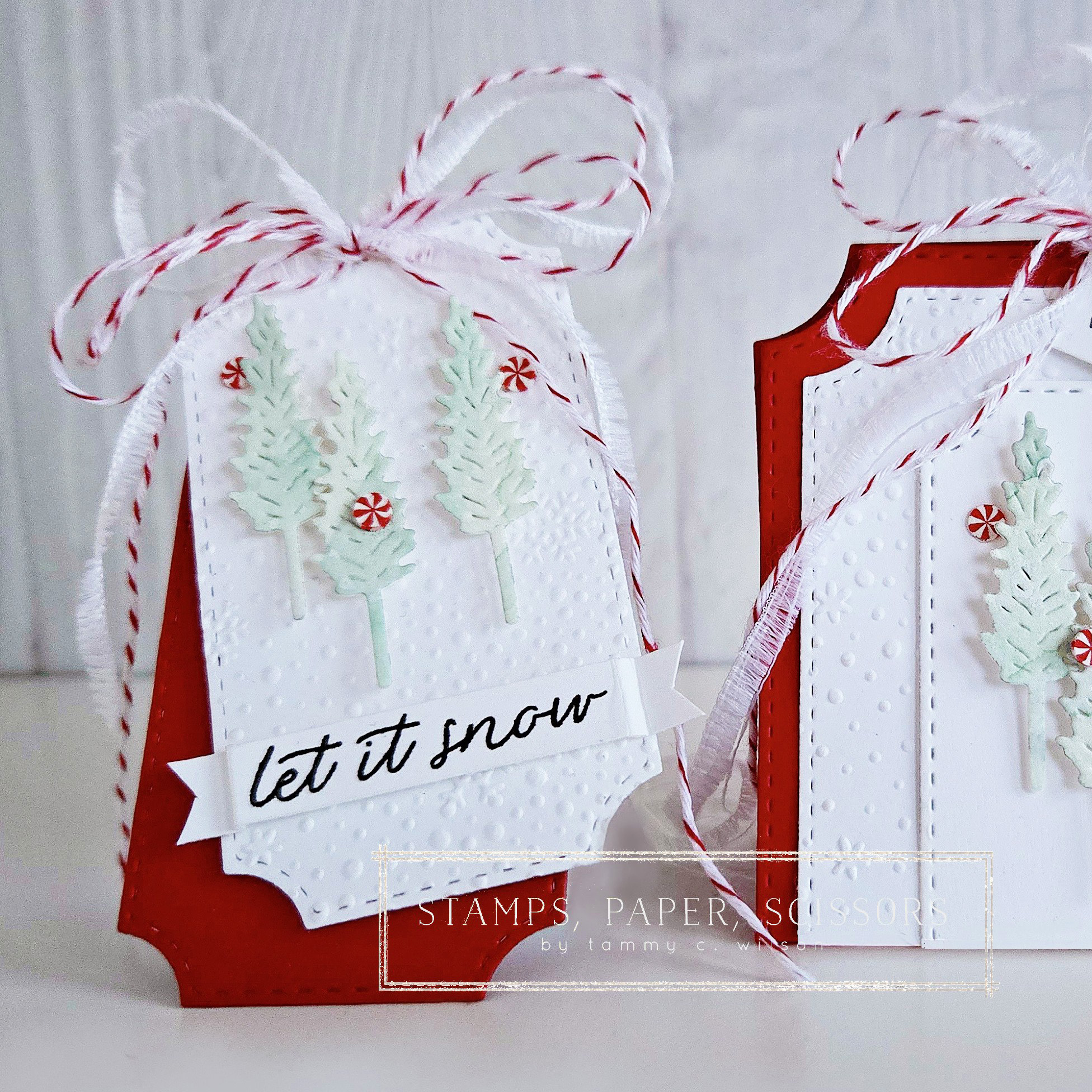 To create the tag and treat holder, I used a few different label dies from the Branching Out Dies, along with Basic White Cardstock and Real Red Cardstock. (For the treat holder, I scored the label twice in the middle, to create a “tent”.) I also embossed the Basic White Thick Cardstock labels with the Snowflake Sky 3D Embossing Folder (retired).