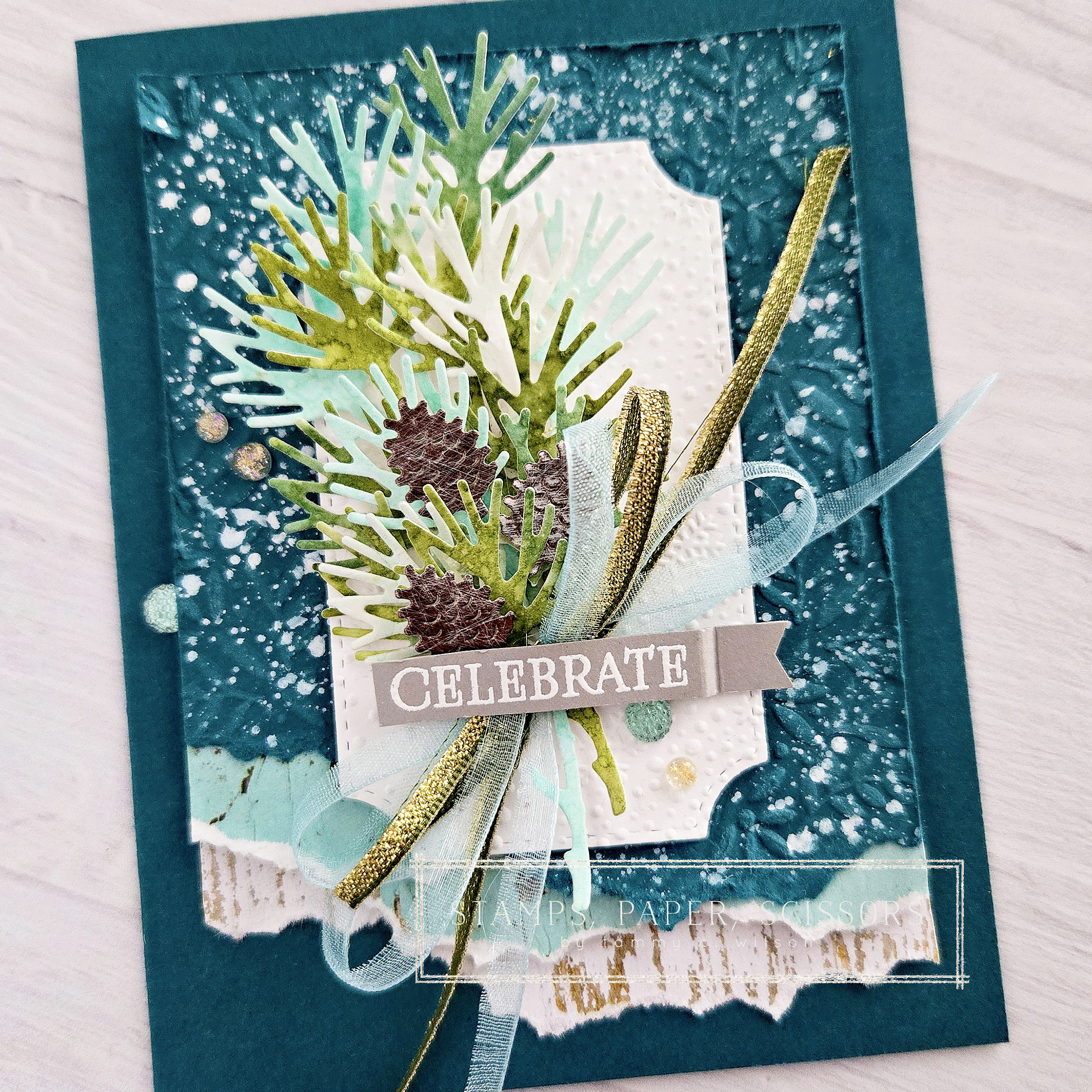 To create the branches, I used Blending Brushes to add Coastal Cabana, Lost Lagoon, and Mossy Meadow to Basic White Thick Cardstock. Next, I used a Water Painter to splatter water droplets. After I dried the paper with a Heat Tool, I used one of the Branching Out Dies to cut out several branches. To create the pinecones, I sanded the Earthen Tone Metallic Specialty Paper with a nail buffing block, then cut out the pinecones with one of the Branching Out Dies.