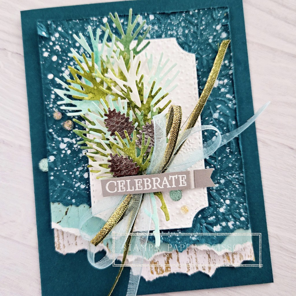 For this card, I started with Pretty Peacock Cardstock, embossed it with the Peaceful Greenery 3D Embossing Folder. I then tore off the bottom edge, and used a Water Painter (along with White Craft Ink) to add some splattering. After I dried the paper with a Heat Tool, I added to two colors of the Country Woods DSP underneath the bottom edge, and popped up the entire panel with Stampin’ Dimensionals. I then cut out a label from Basic White Thick Cardstock (using one of the Branching Out Dies), embossed it with the Snowflake Sky Embossing Folder (retired), and popped it up with more Stampin’ Dimensionals.