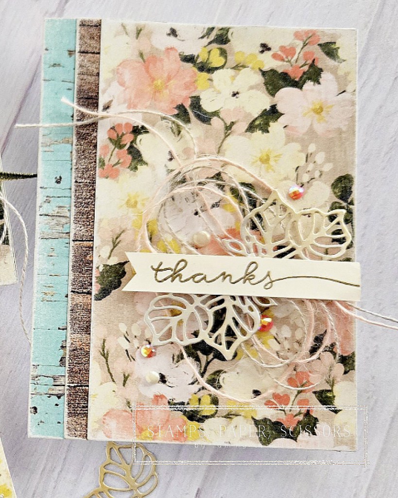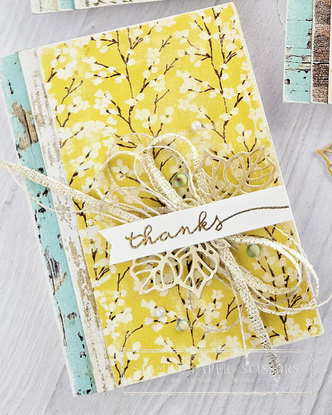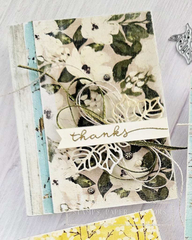 12.31.2025…..Happy New Year’s Eve, my stampin’ friends! As the holiday season is coming to an end, it is time for me to start creating some thank you cards for the wonderfully festive gifts and goodies that I’ve received. For these 3-1/2″ x 5″ note cards, I combined the Country Woods Designer Series Paper and the Brushed with Beauty Designer Series Paper. I also used a nail buffer block to give the paper a more rustic look. Hope these little notecards inspire you to create a few thank you cards as well.