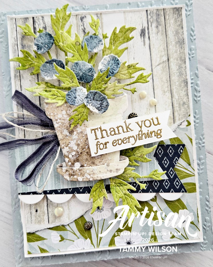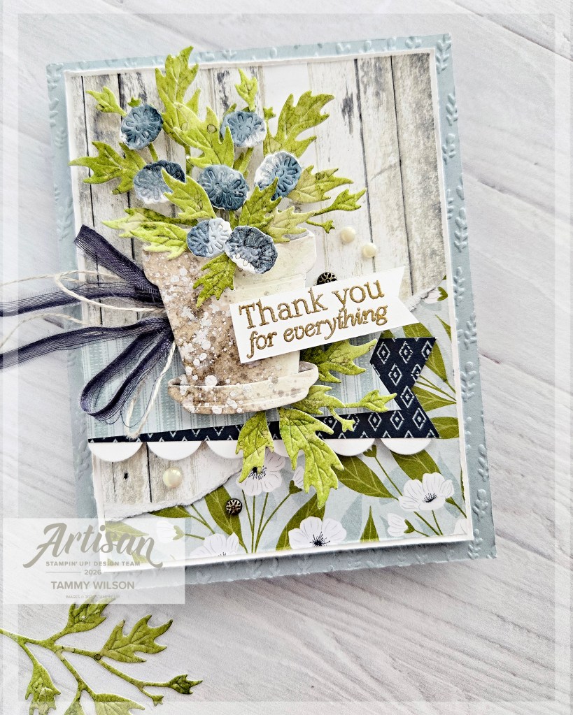 About my project: For this card, I used one of my all-time favorite products…..the Country Woods Designer Series Paper! I also love to mix and match that specific DSP with other DSP collections as well, and I decided to add in the Lovely Blossoms DSP. The Help Me Grow Bundle (available to customers beginning March 3, 2026) is one of my brand new faves, and I couldn’t wait to use it for this hop! I also like to call my specific style “shabby chic with a modern twist”, and I incorporate that into most of the projects that I create, including today’s card.