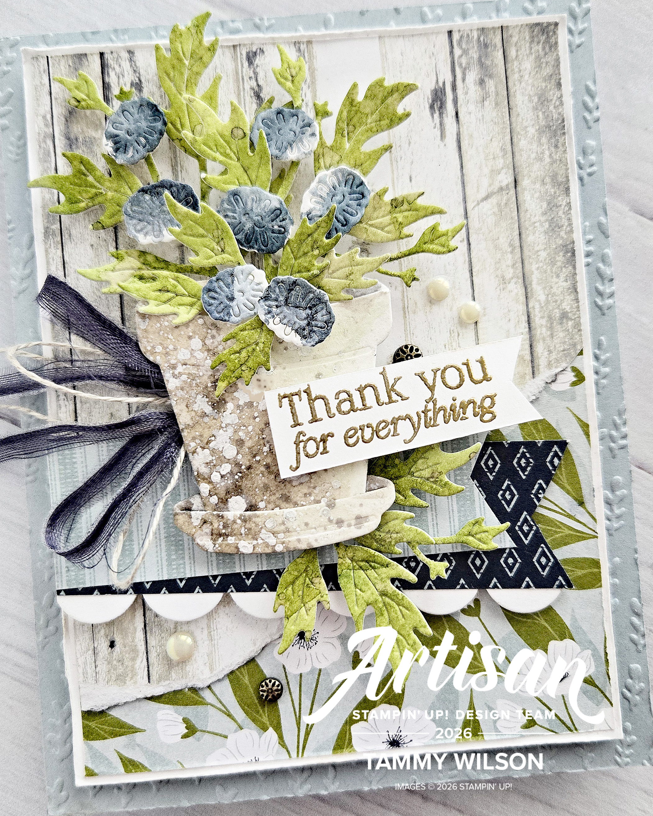About my project: For this card, I used one of my all-time favorite products…..the Country Woods Designer Series Paper! I also love to mix and match that specific DSP with other DSP collections as well, and I decided to add in the Lovely Blossoms DSP. The Help Me Grow Bundle (available to customers beginning March 3, 2026) is one of my brand new faves, and I couldn’t wait to use it for this hop! I also like to call my specific style “shabby chic with a modern twist”, and I incorporate that into most of the projects that I create, including today’s card.