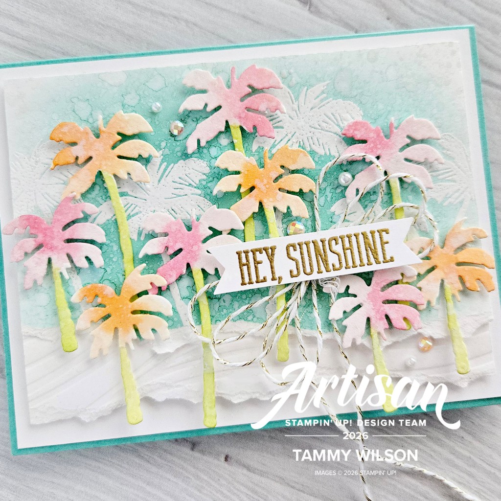 For the background, I used a Blending Brush to add Coastal Cabana Cardstock, and splattered water droplets with a Water Painter. After I dried the cardstock with a Heat Tool, I heat-embossed the palm trees (from the Boardwalk Fun Stamp set), using my Versamark Pad. I also tore off the bottom edge of the cardstock.