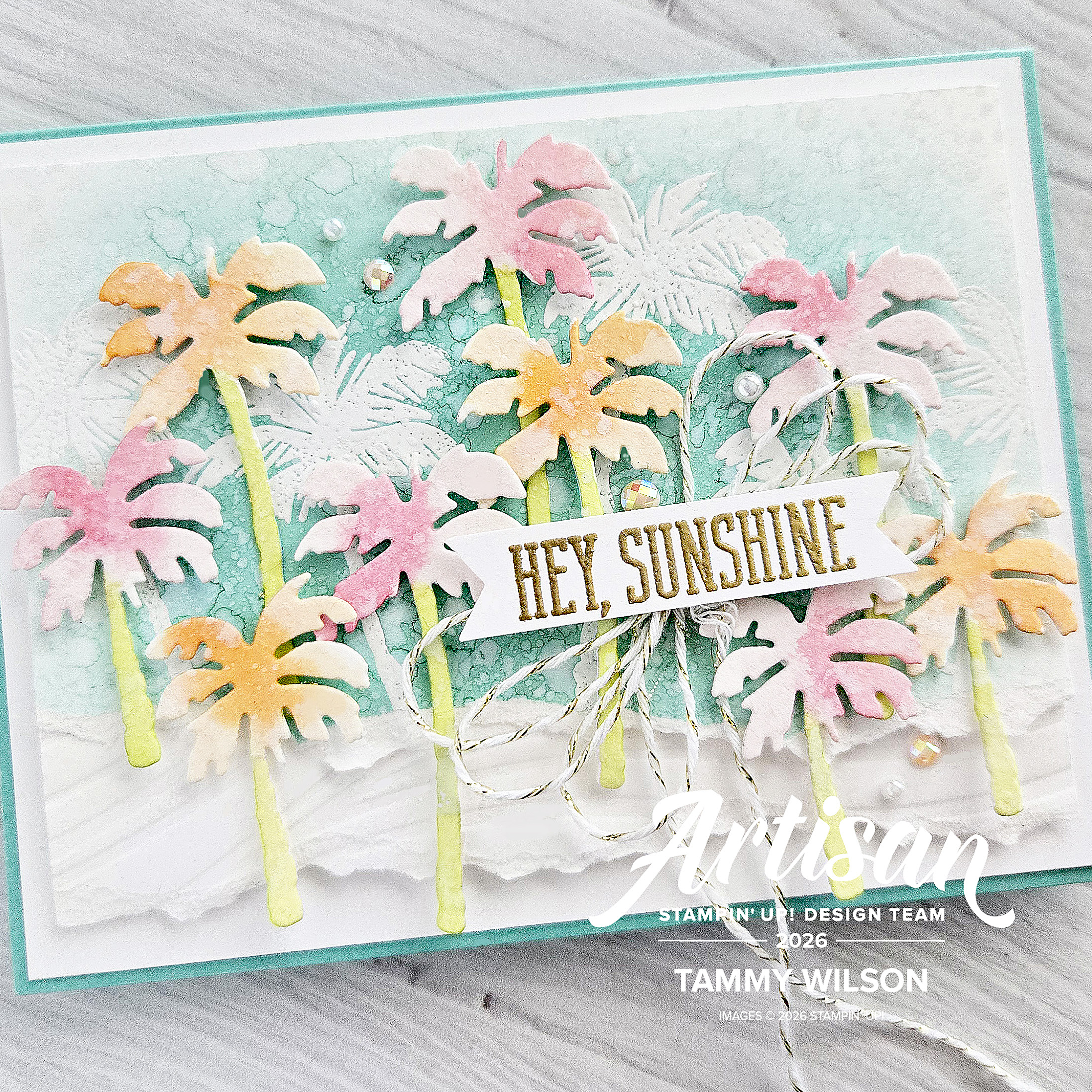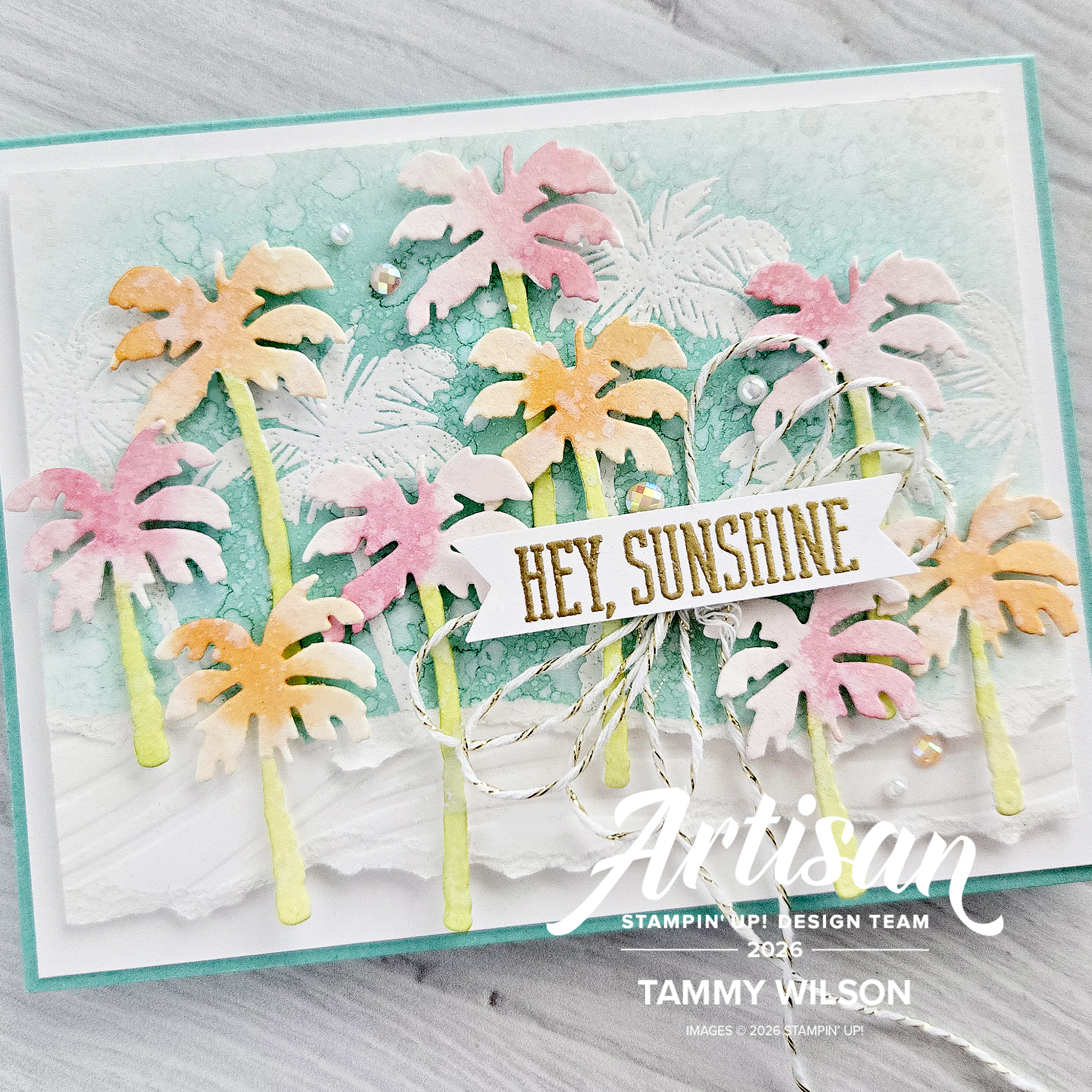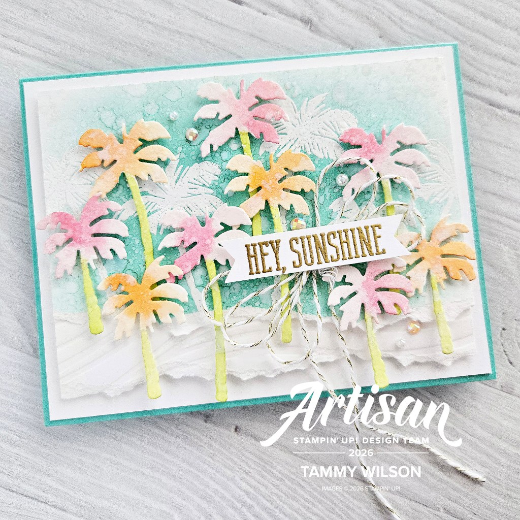 For the background, I used a Blending Brush to add Coastal Cabana Cardstock, and splattered water droplets with a Water Painter. After I dried the cardstock with a Heat Tool, I heat-embossed the palm trees (from the Boardwalk Fun Stamp set), using my Versamark Pad. I also tore off the bottom edge of the cardstock.