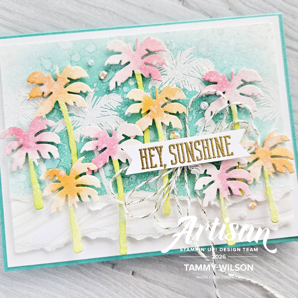 I used the Boardwalk Fun Dies to cut out out the palm trees from Fluid 100 Watercolor Paper. I then used a Water Painter to color the palm trees, along with…..Petunia Pop, Bubble Bath, Timid Tiger, and Granny Apple Green. Next, I used a Water Painter, along with White Craft Ink, to splatter the palm trees.