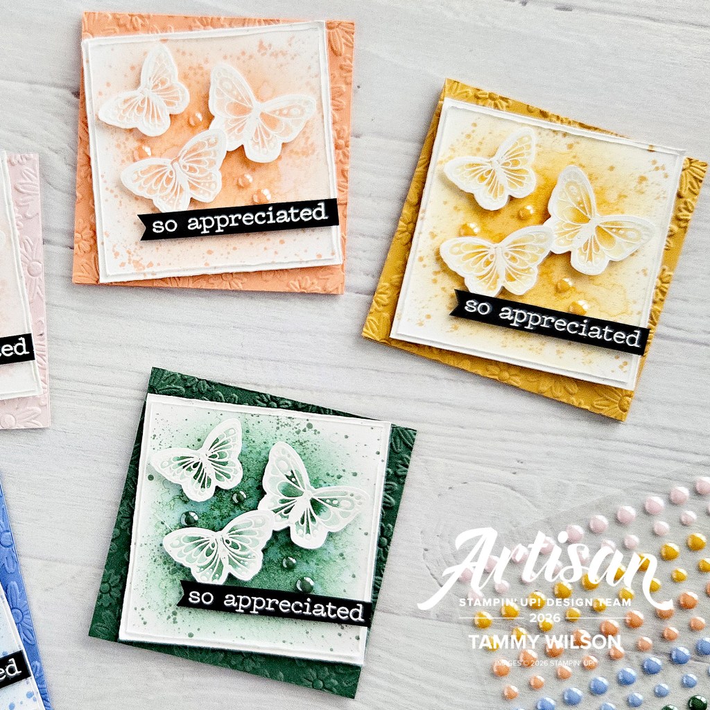 04.122026…..Happy Sunday, my stampin’ friends! I’m so excited to share this five little 3″ x 3″ cards that I created with the brand new Stampin’ Up! 2026 – 2028 In Colors…..Barely Blush, Crisp Cantalope, Golden Glow, Hydrangea Hue, and Peaceful Pine! I absolutely love them all, and I thought it would be fun to pair them with the brand new All Aflutter Bundle! Hope this inspires you to create something brand new with these amazing products!
