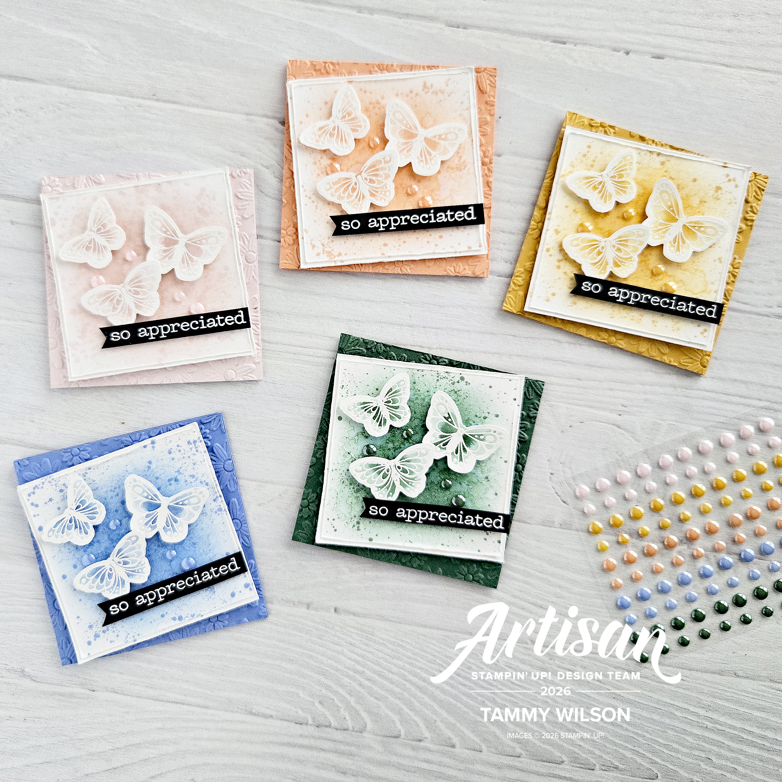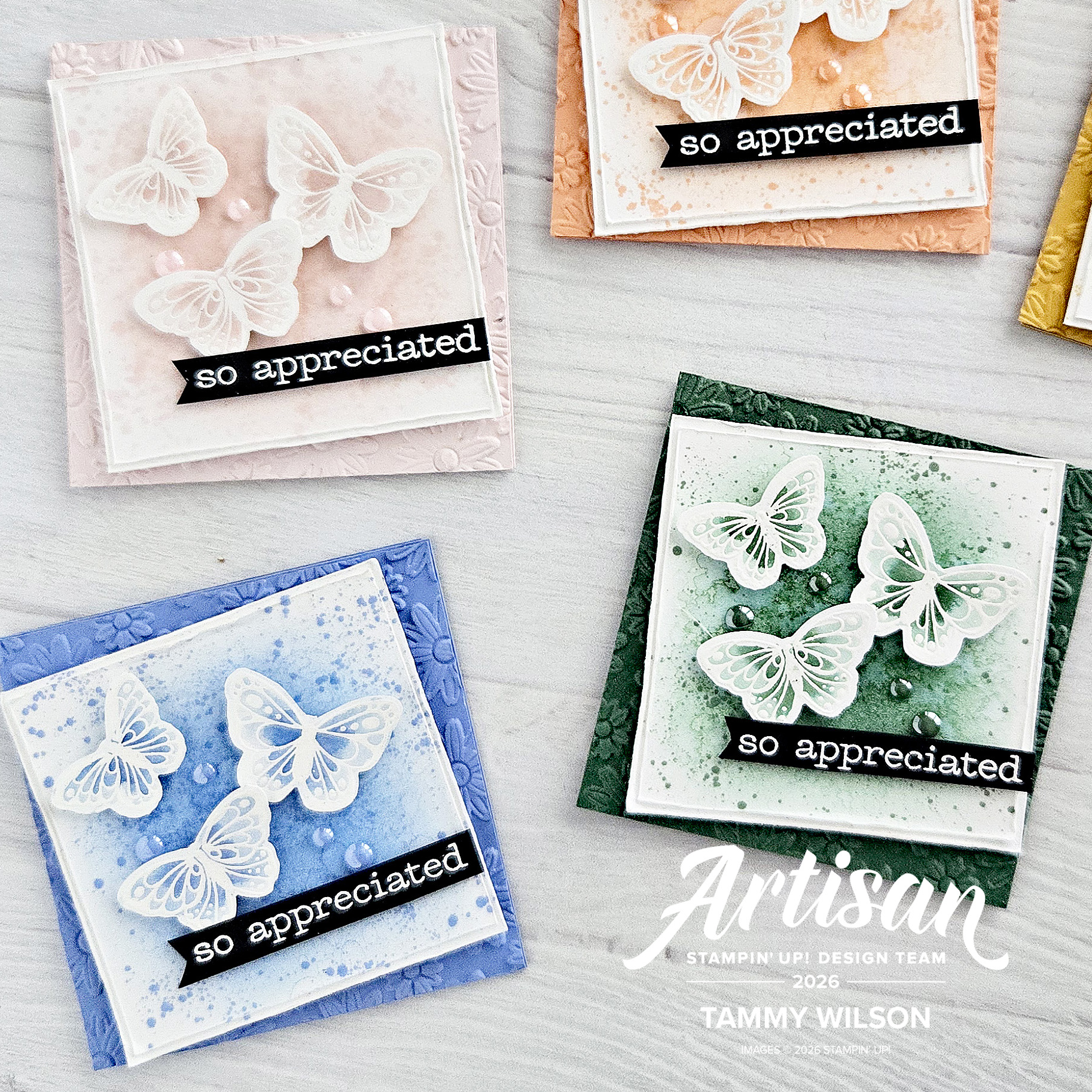 04.122026…..Happy Sunday, my stampin’ friends! I’m so excited to share this five little 3″ x 3″ cards that I created with the brand new Stampin’ Up! 2026 – 2028 In Colors…..Barely Blush, Crisp Cantalope, Golden Glow, Hydrangea Hue, and Peaceful Pine! I absolutely love them all, and I thought it would be fun to pair them with the brand new All Aflutter Bundle! Hope this inspires you to create something brand new with these amazing products!