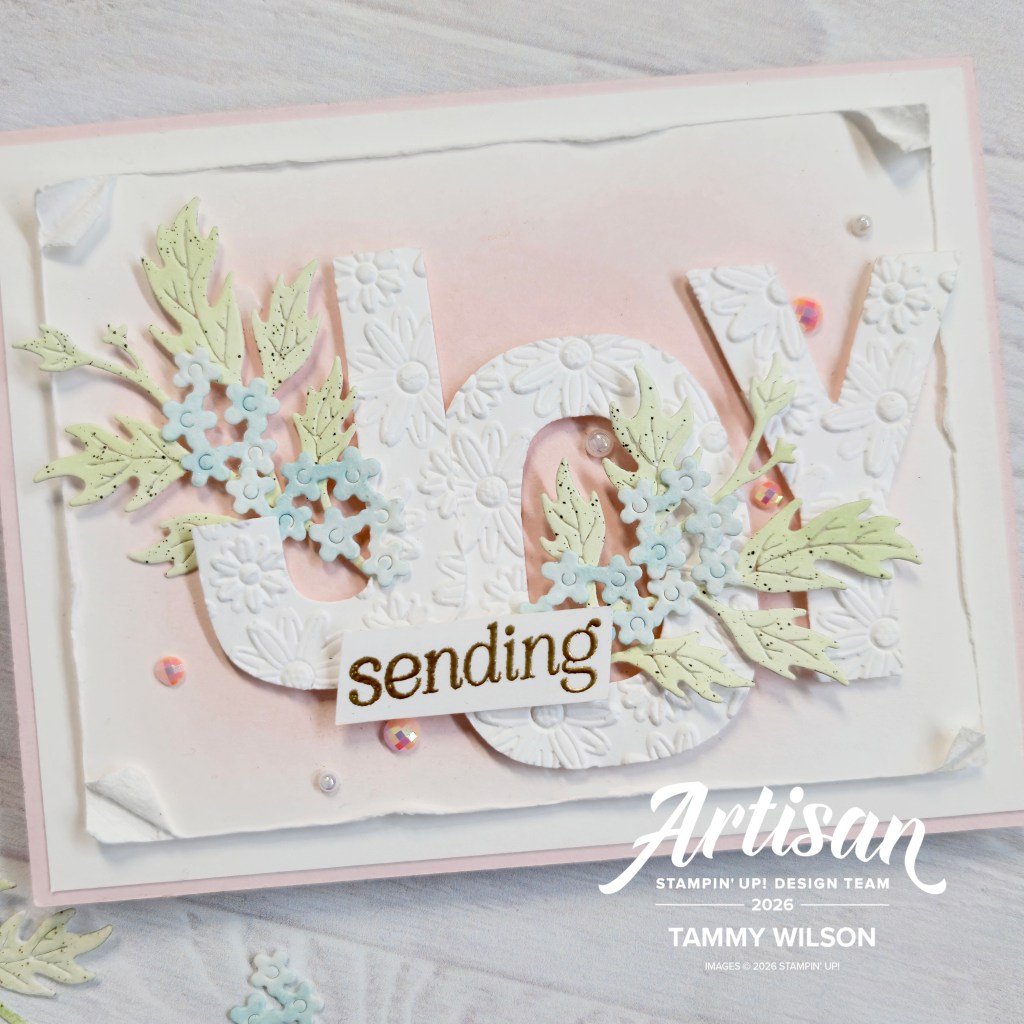 I decided to add “joy” to my card, by using the Party Alphabet Dies. I also embossed the letters with the Lazy Daisy 3D Embossing Folder. For the little flowers and leaves, I used the Grow With Me Dies. For my color combo, I used Barely Blush, Soft Sea Foam and Balmy Blue. Hope this card inspires you to add a little joy to your cards or projects as well!