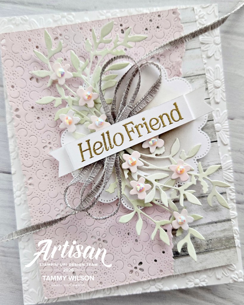 To create this card, I started with some Basic White Thick Cardstock, embossed it with the Lazy Daisy 3D Embossing Folder, and adhered it to a Basic White Thick Cardstock base. I also used the Eyelet Blooms Die (Stampin’ Up! April 2026 Product of the Month), along with Barely Blush Cardstock, and tore off the right side of the cardstock. Tucked underneath the torn edge is some Country Woods Designer Series Paper. I then popped up the entire panel with Stampin’ Dimensionals.